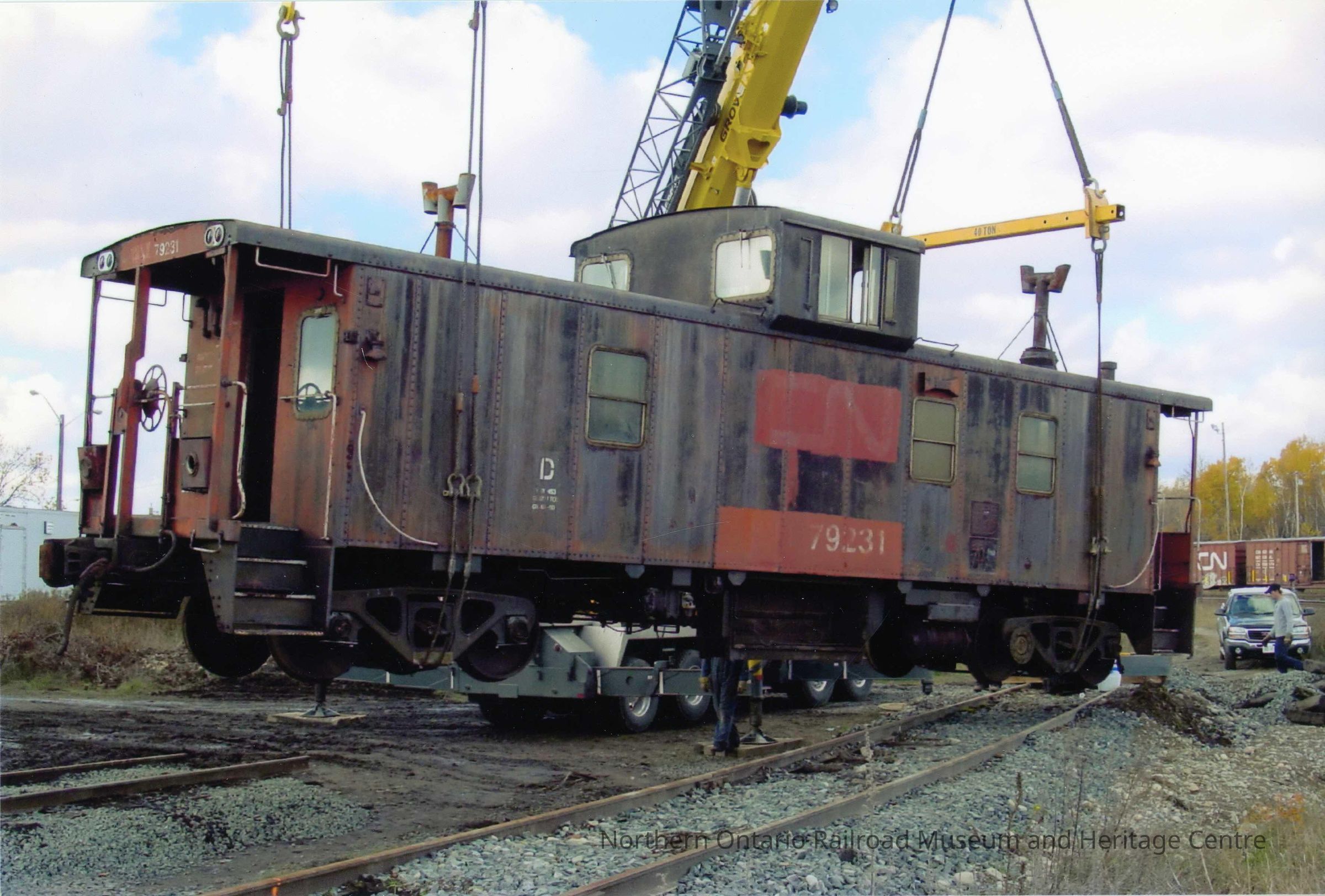 Coloured photograph showing the steel caboose being installed in Prescott Park at the Northern Ontario Railroad Museum and Heritage Centre. The photograph shows the caboose being lifted onto a track by means of a large crane.Photograph Details