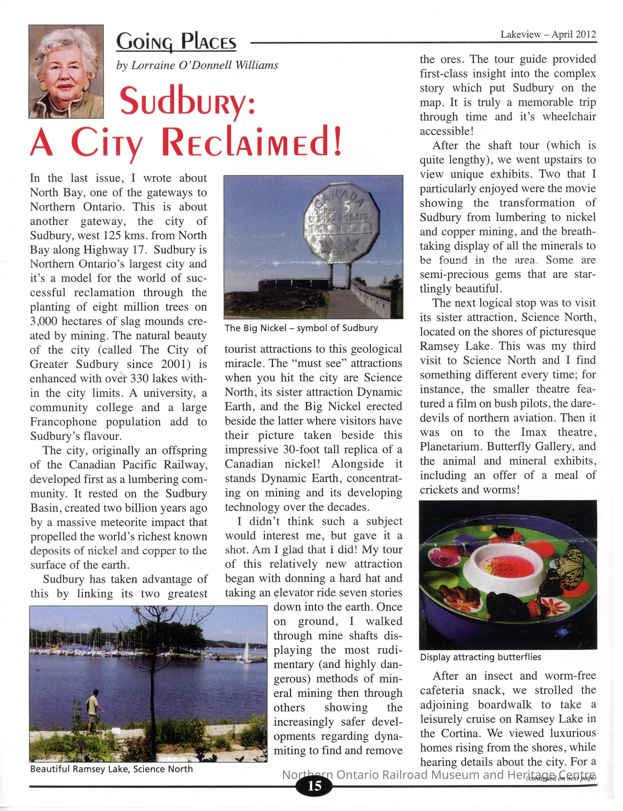 "Sudbury: A City Reclaimed!" by Lorraine O'Donnell Williams. Part of the "Going Places" column in Seniors Review April 2012 Issue. Features a portion devoted to a trip to NORMHC by the writer.Collection