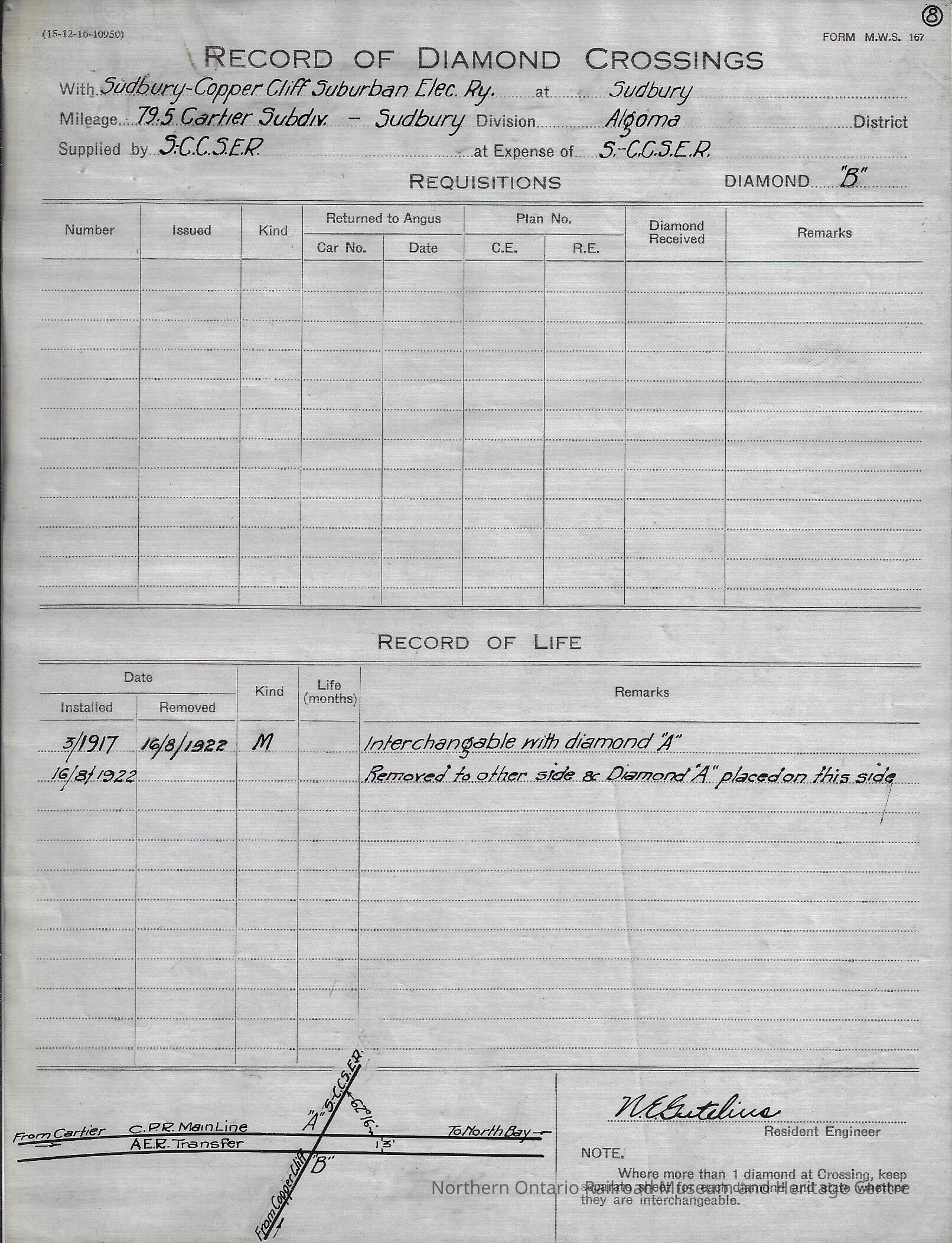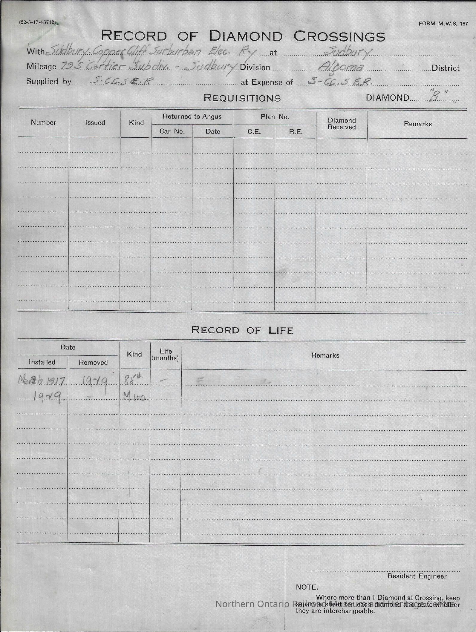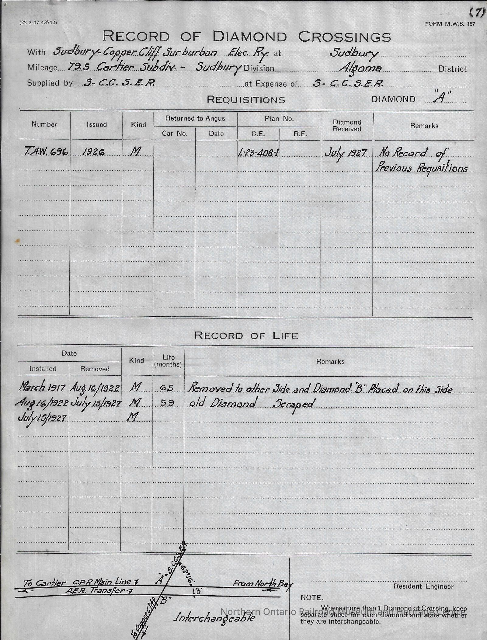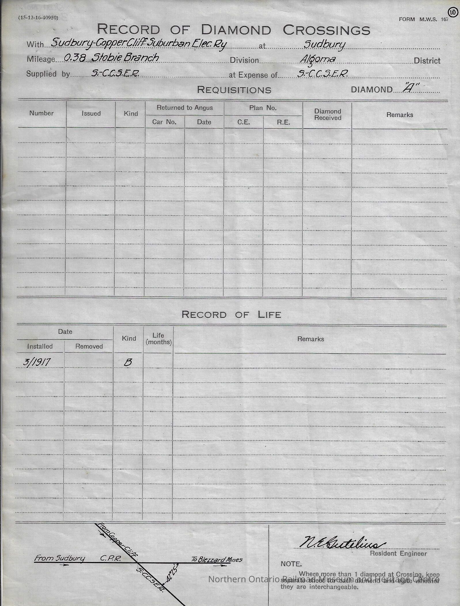 Eight different "Record of Diamond Crossings" forms filled out by the Sudbury Copper Cliff Suburban Electric Railway Company documenting when diamond crossings were installed and if/when they were removed. The records are from the years 1917-1927.Creator