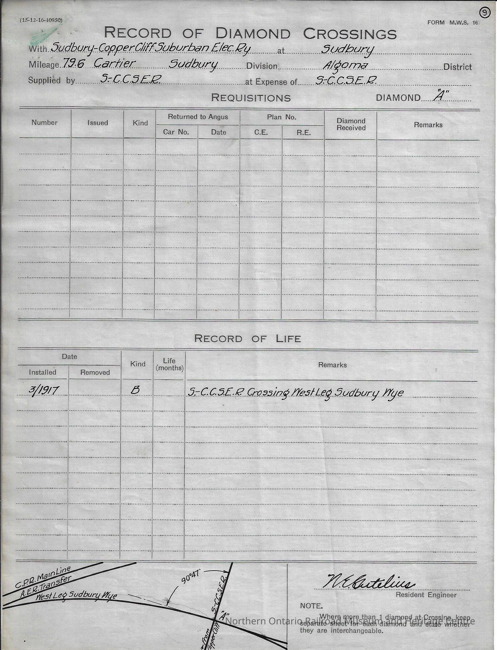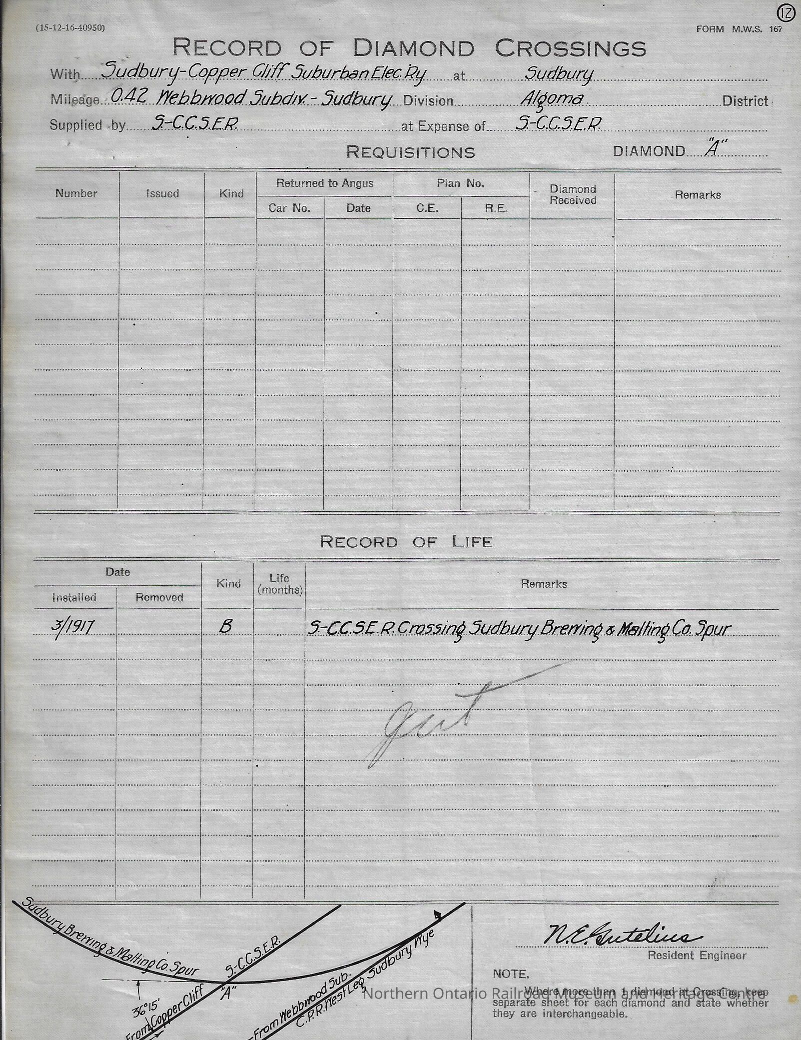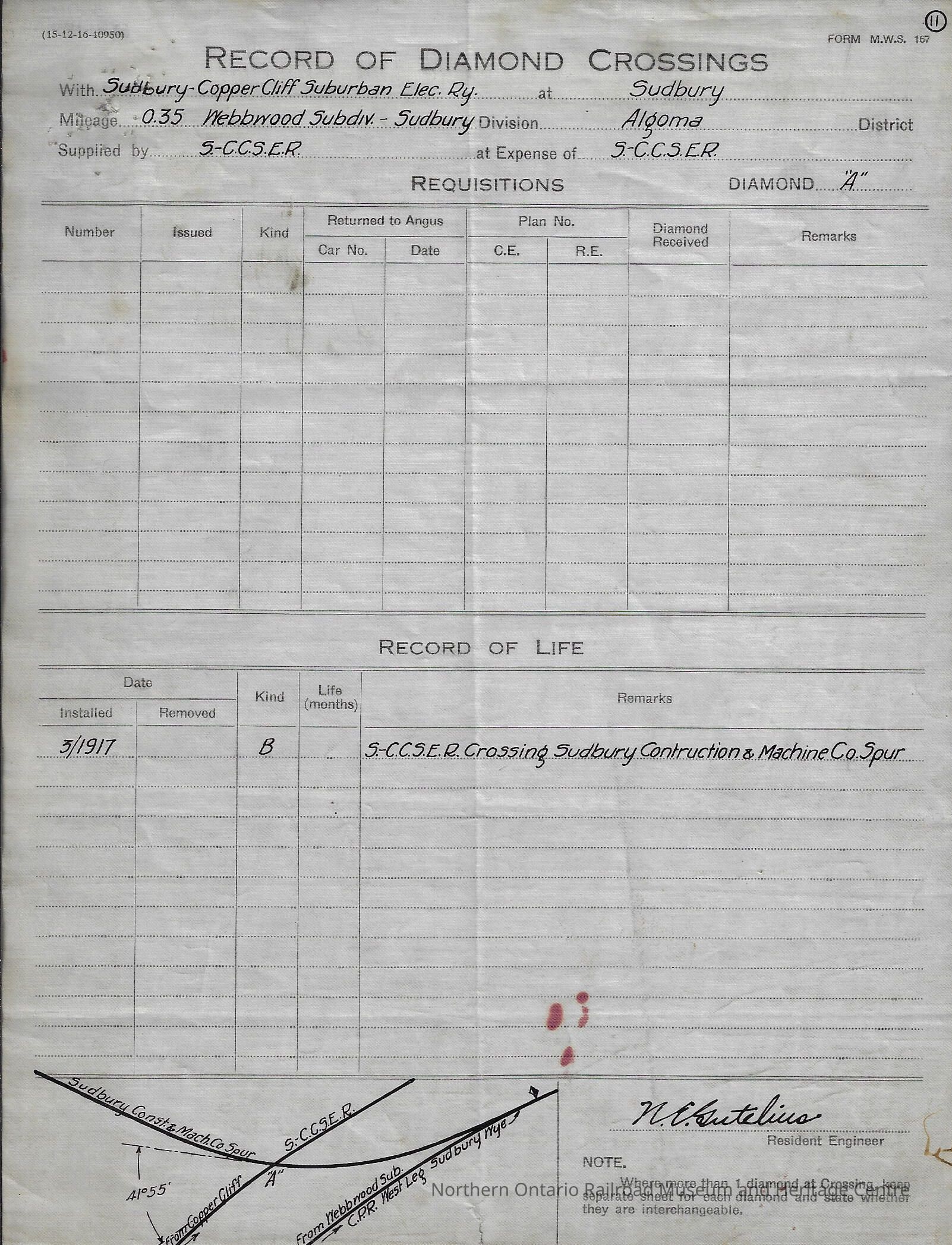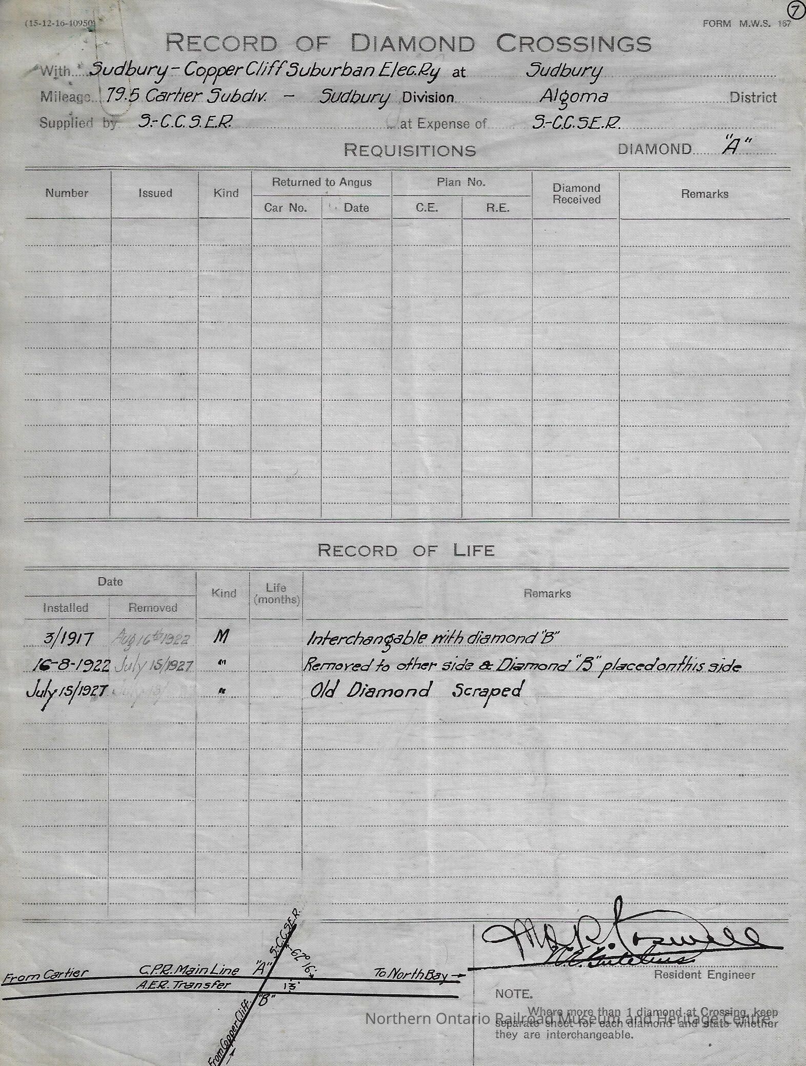 Eight different "Record of Diamond Crossings" forms filled out by the Sudbury Copper Cliff Suburban Electric Railway Company documenting when diamond crossings were installed and if/when they were removed. The records are from the years 1917-1927.Creator