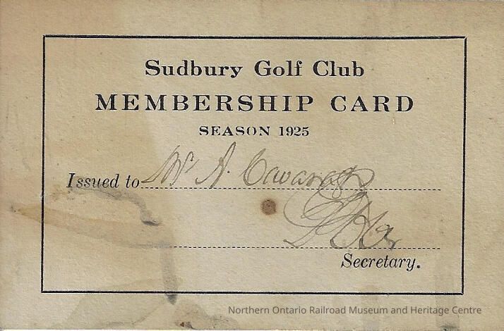 Sudbury Golf Club membership card for the 1925 season. The card was issued to Mr. A. Cavanaugh. It allowed him to golf at the club.Context