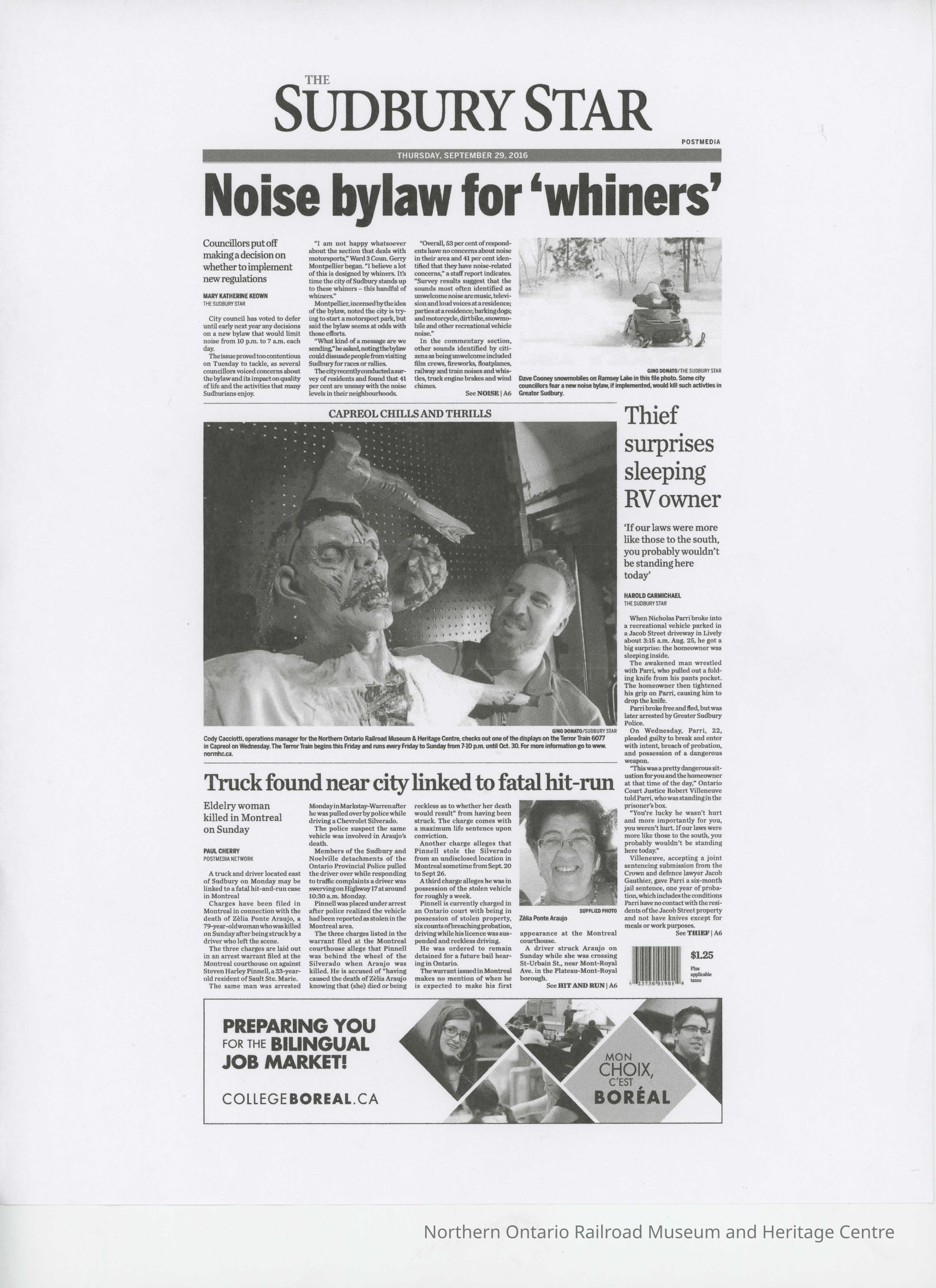 Photocopy of the front page of the September 29th, 2016 edition of the Sudbury Star, featuring NORMHC opening of the Terror Train for the 2016 Season.Context