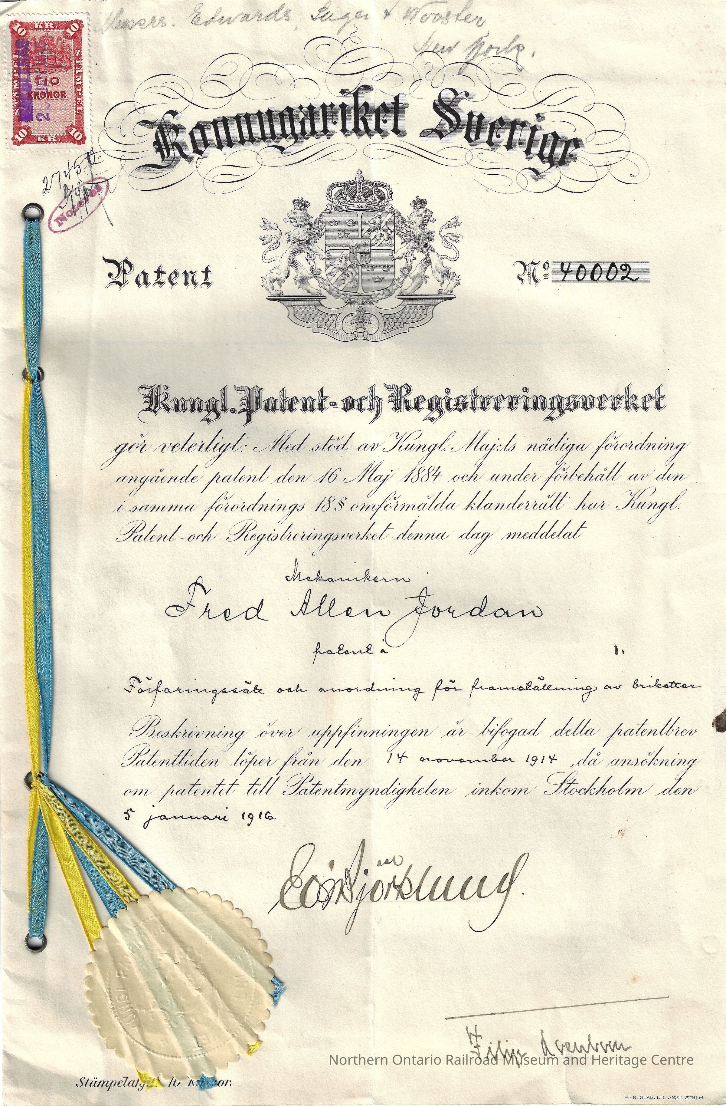 Swedish letters of patent, no. 40002, issued November 14, 1914 and signed January 5th 1916 for fifteen years in the name of Alan Jordan for his improvements in methods of making briquets" - "Förfaringssätt och anordning for framställning av briketter". Includes a letter regarding the patent from Edwards, Sager and Wooster to Moose Mountain Limited (date February 16, 1916.) The patent letters have four holes punched in the left side, with small metal rings inserted, and are tied together with light blue and yellow ribbon, affixed to the front of the document with the official seal of the Kingdom of Sweden patent office. The documents include three pages of description of the invention, from Fred A. Jordan, written (probably translated by another individual) in Swedish. These are followed by a single page with a technical diagram, and further writing, in Swedish, on the inside rear cover.Collection