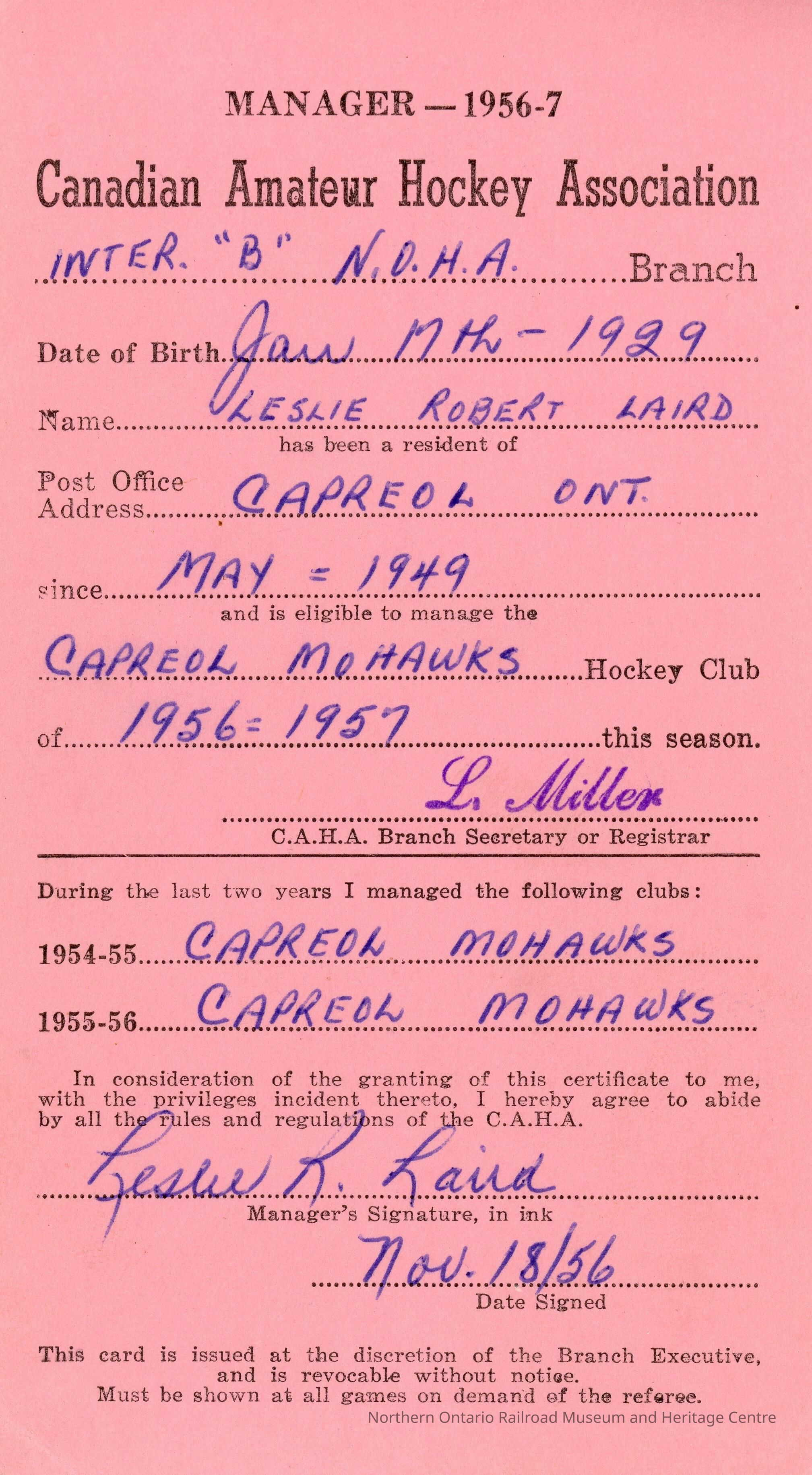 Team manager registration certificate for the Canadian Amateur Hockey Association belonging to Leslie Robert Laird for the 1956-1957 yearContext