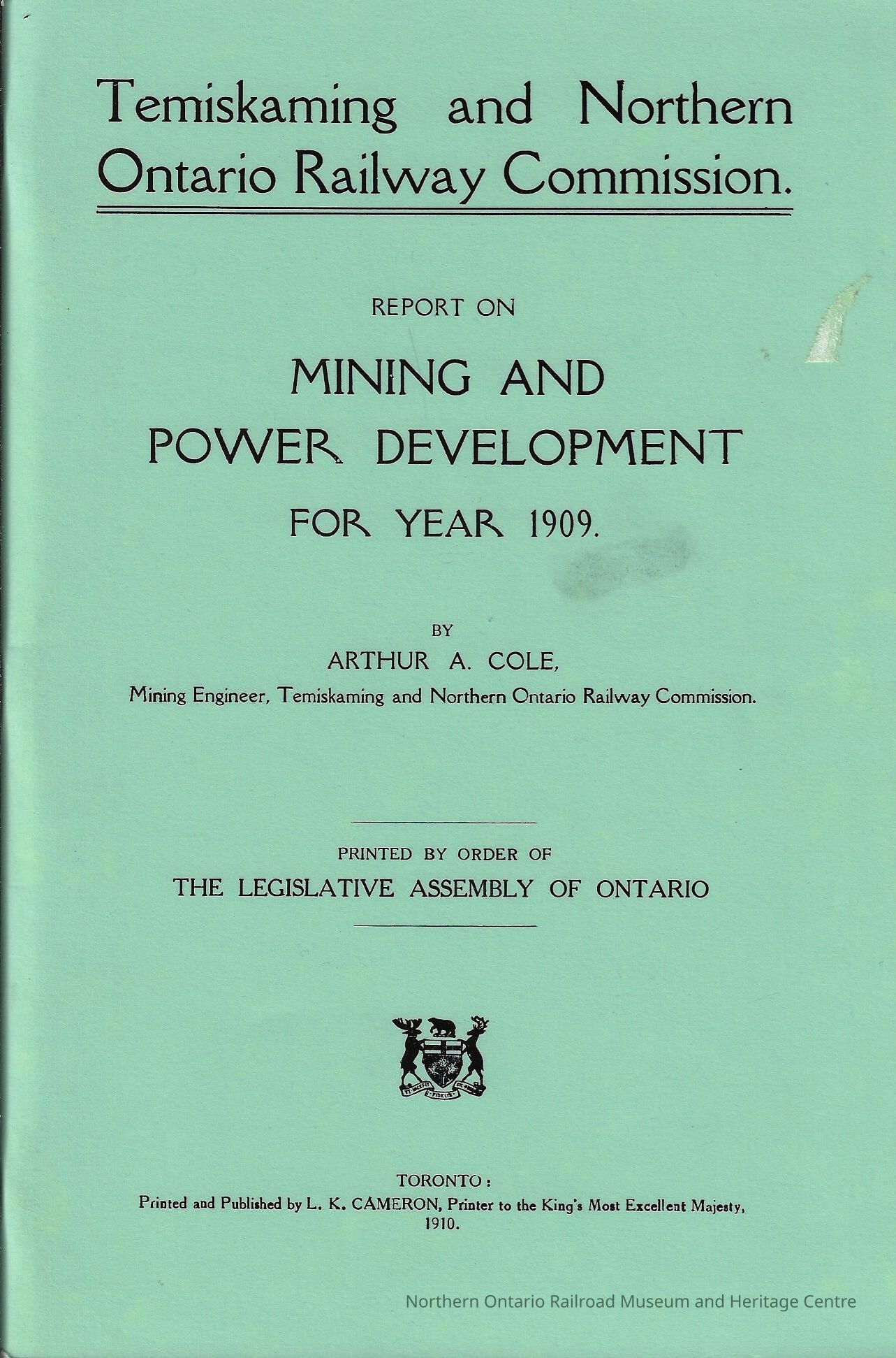 Book, report on mining and power development for the year 1909, prepared by the Temiskaming and Northern Ontario Railway Commission.Context