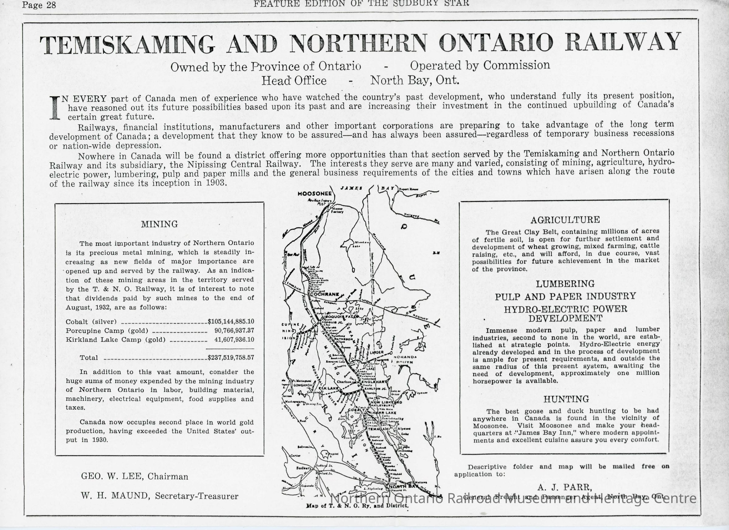 "Temiskaming and Northern Ontario Railway" in The Sudbury Star (pg. 28), Date Unknown. Includes map of operations as well as services available, as well as financial impact for each sector controlled.Collection