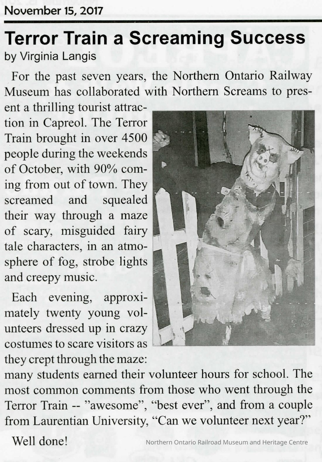 "Terror Train a Screaming Success" by Virginia Langis in The Capreol Express, November 15, 2017Description