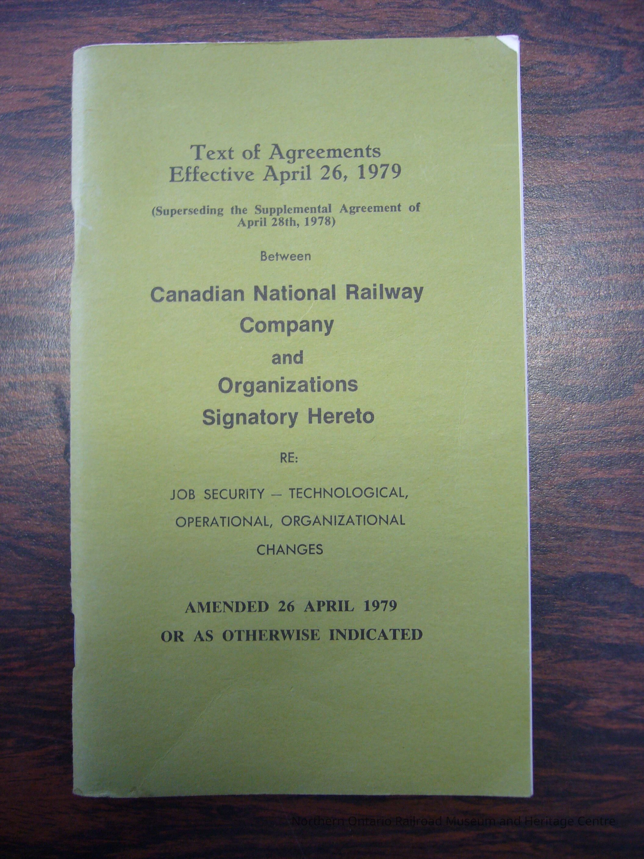 Text of agreements effective April 26, 1979 (superseding the supplemental agreement of April 28th, 1978) between Canadian National Railway Company and organizations signatory hereto re: job security - technological, operational, organizational changes. Amended 26 April 1979 or as otherwise indicated.Collection