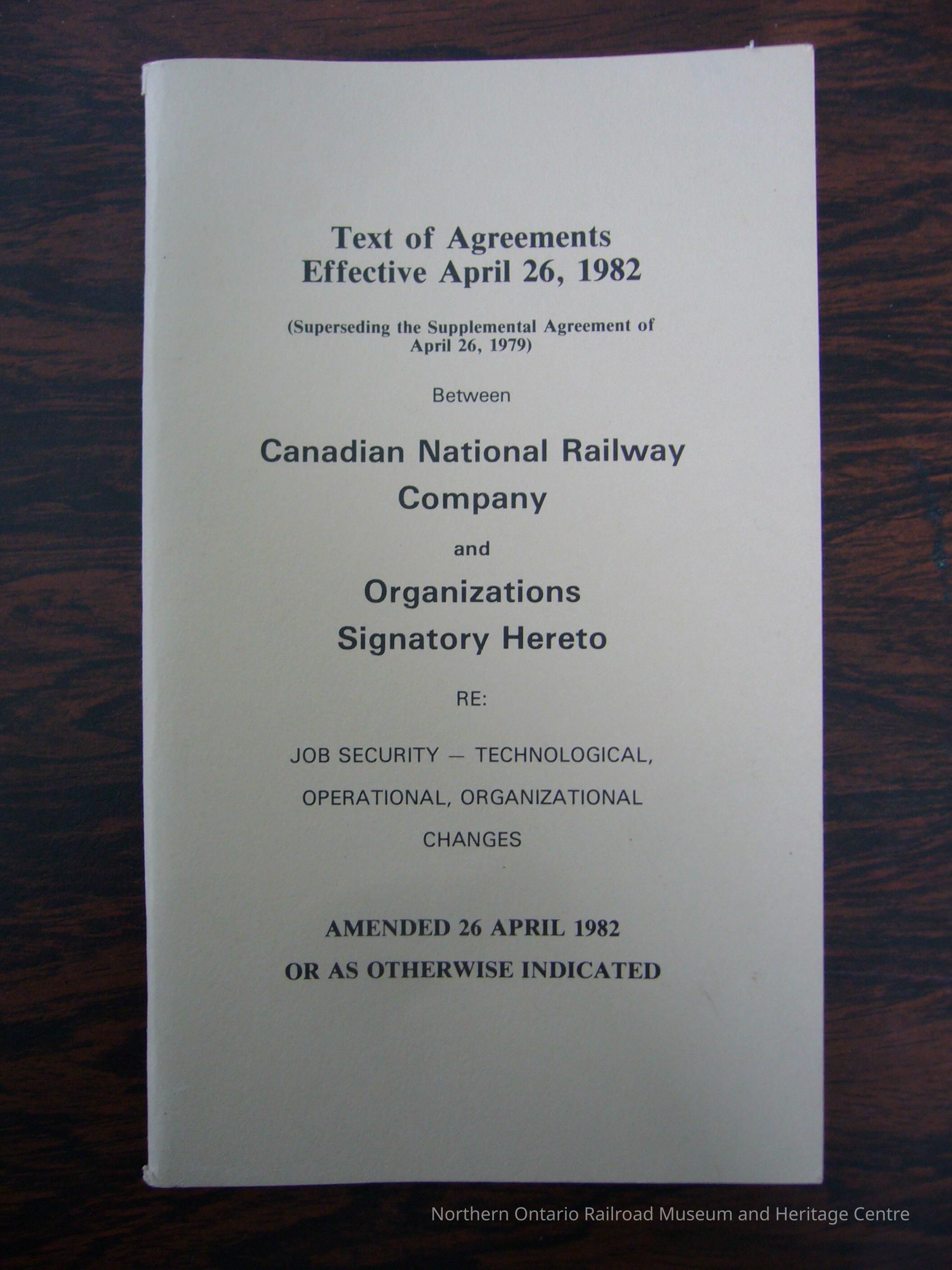 Text of Agreements Effective April 26, 1982 Between Canadian National Railway Company and Organizations Signatory Hereto Re: Job Security - Technological, Operational, Organizational Changes, Amended 26 April 1982 or as Otherwise Indicated.Collection