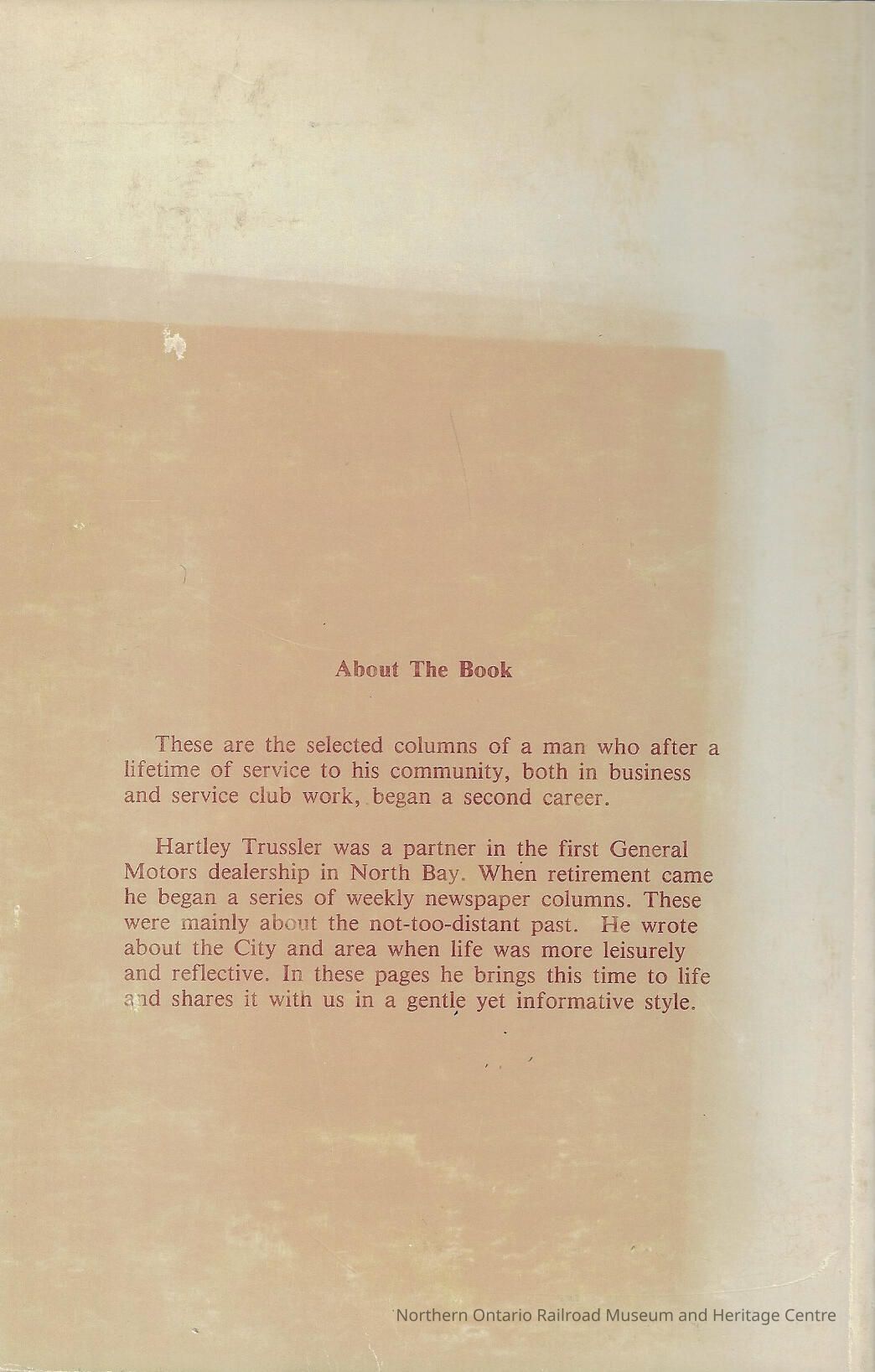 Book containing a compilation of columns pertaining to North Bay's history, written by Hartley Trussler, compiled by Michael Barnes.Context