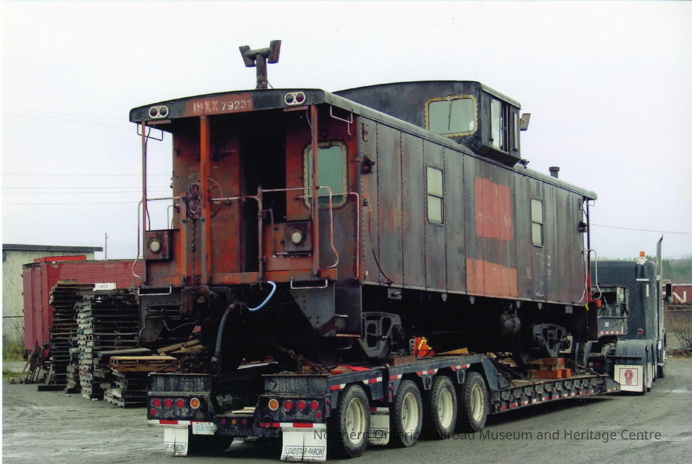 Coloured photograph showing the Canadian National/INCO Steel Caboose on a flatbed truck, being delivered to Prescott Park to be put on display at the Northern Ontario Railroad Museum and Heritage Centre.Photograph Details
