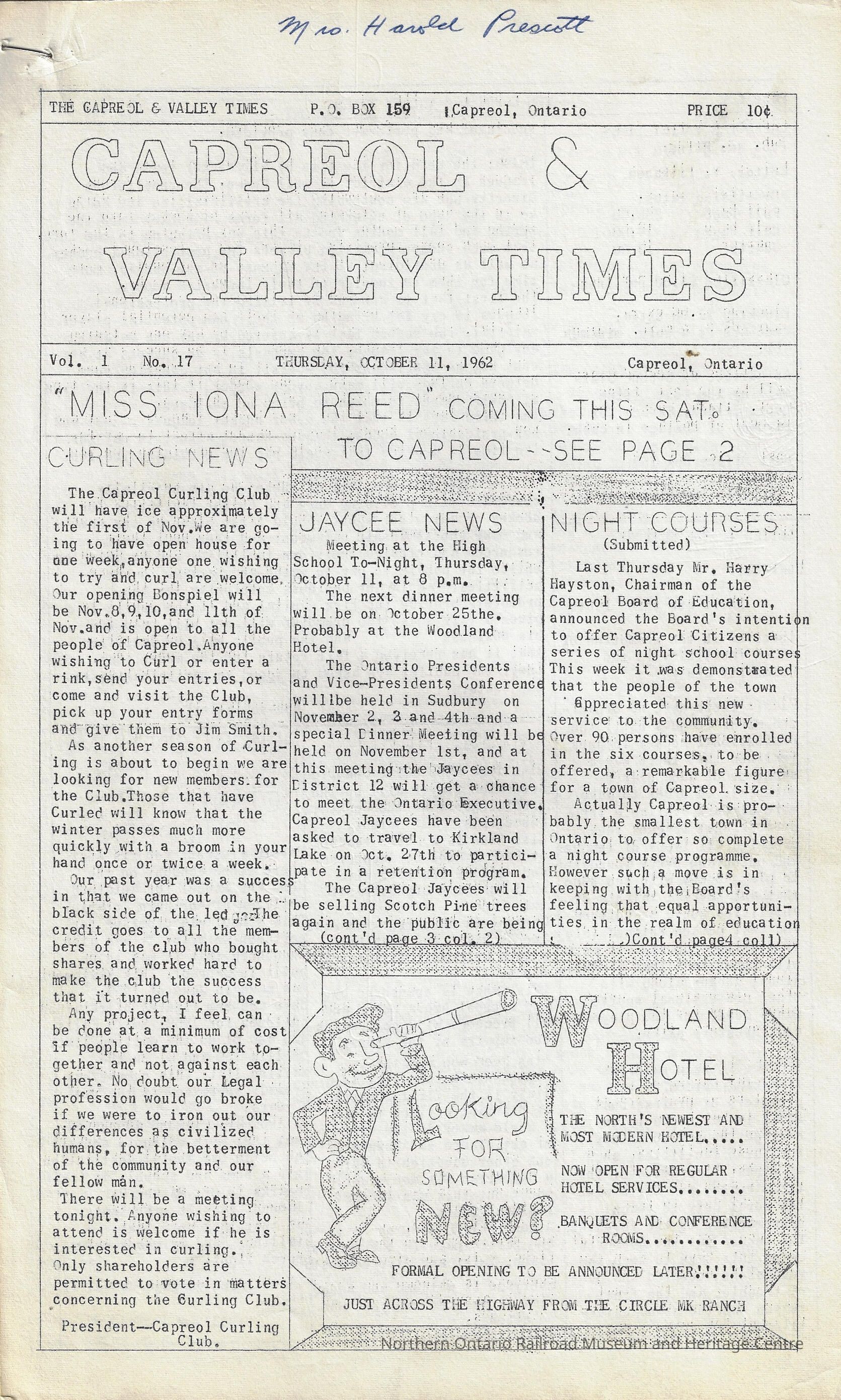 Newsletter, Capreol and Valley Times Volume 1 number 17, October 11th, 1962. The newsletter was a local newspaper that published local news and stories. It also includes advertisements from local businesses and other local announcements. The major highlights for this edition would be, "Miss Iona Reed Coming this Sat to Capreol," "Curling News," and "Night Courses."