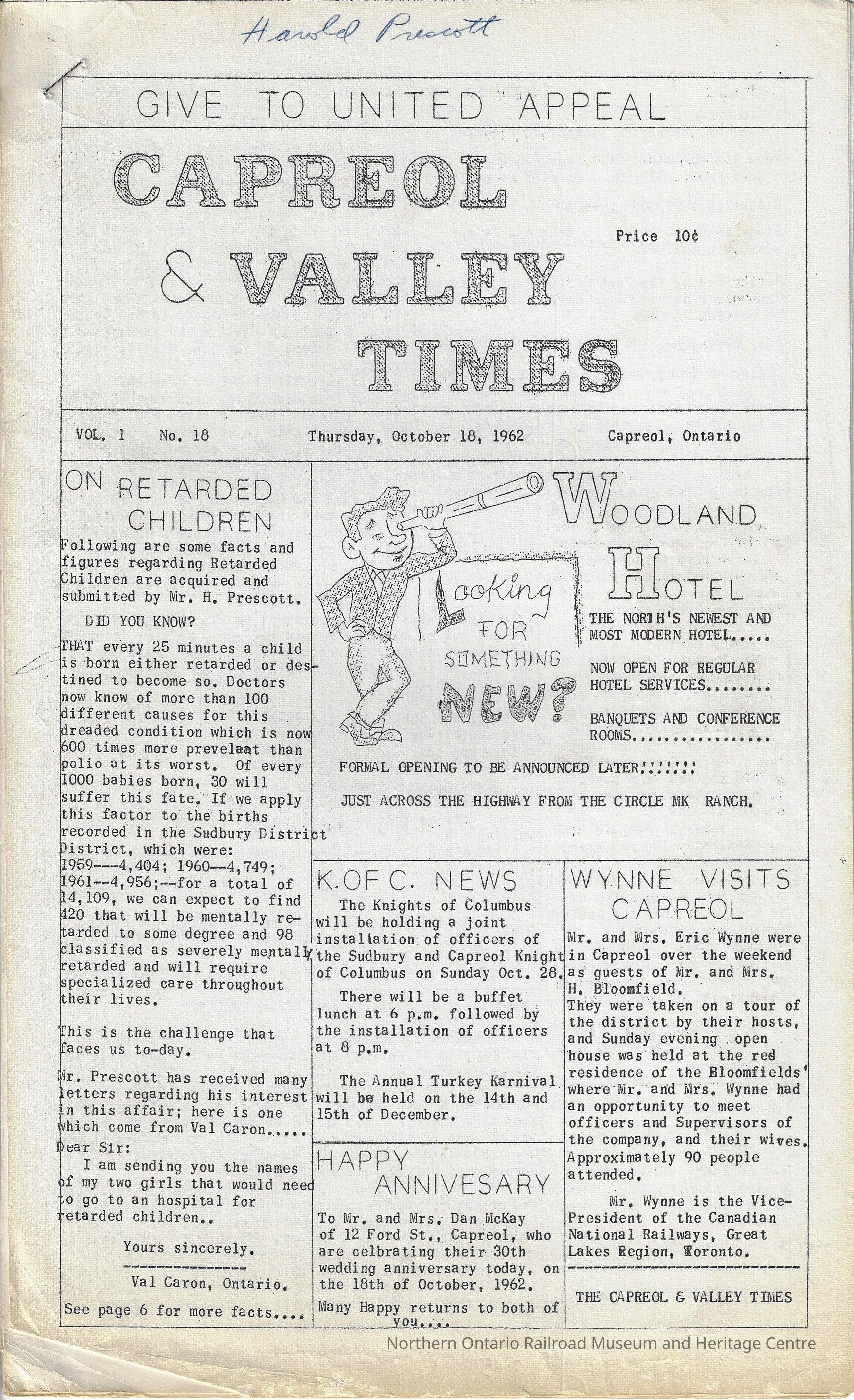 Newsletter, Capreol and Valley Times, Volume 1 number 18, October 18, 1962. The newsletter discusses local news and stories as well as local events happening in Capreol and Valley East. It also includes advertisements from local businesses, classified ads and announcements. The top story in this edition is discussing the for a hospital/school for "Retarded Children" and how it is badly needed in the Nickel belt.