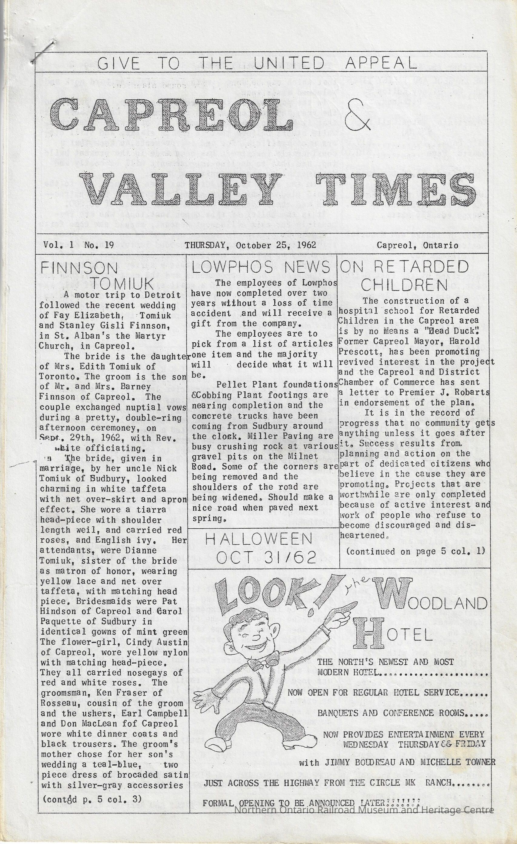 Newsletter, the Capreol and Valley Times, volume 1, number 19, October 25th, 1962. The newsletter discusses local news, events, concerns, announcements, and stories. It also includes advertisements from local businesses and classified ads. The top stories for this edition relate to the "Retarded Children" hospital/school, as well as letters to Harold Prescott.