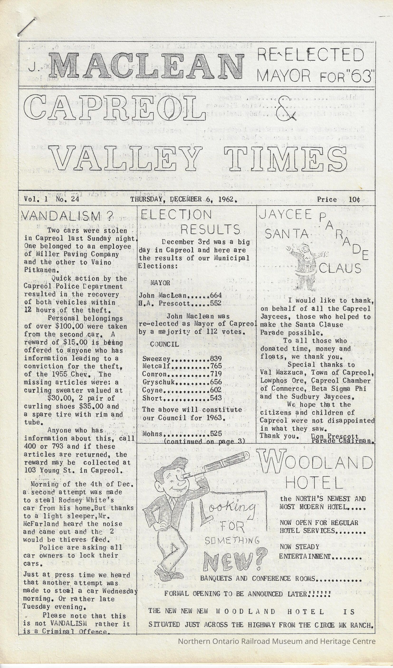 The Capreol and Valley Times: Vol 1 (24) December 6, 1962Entry/Object ID