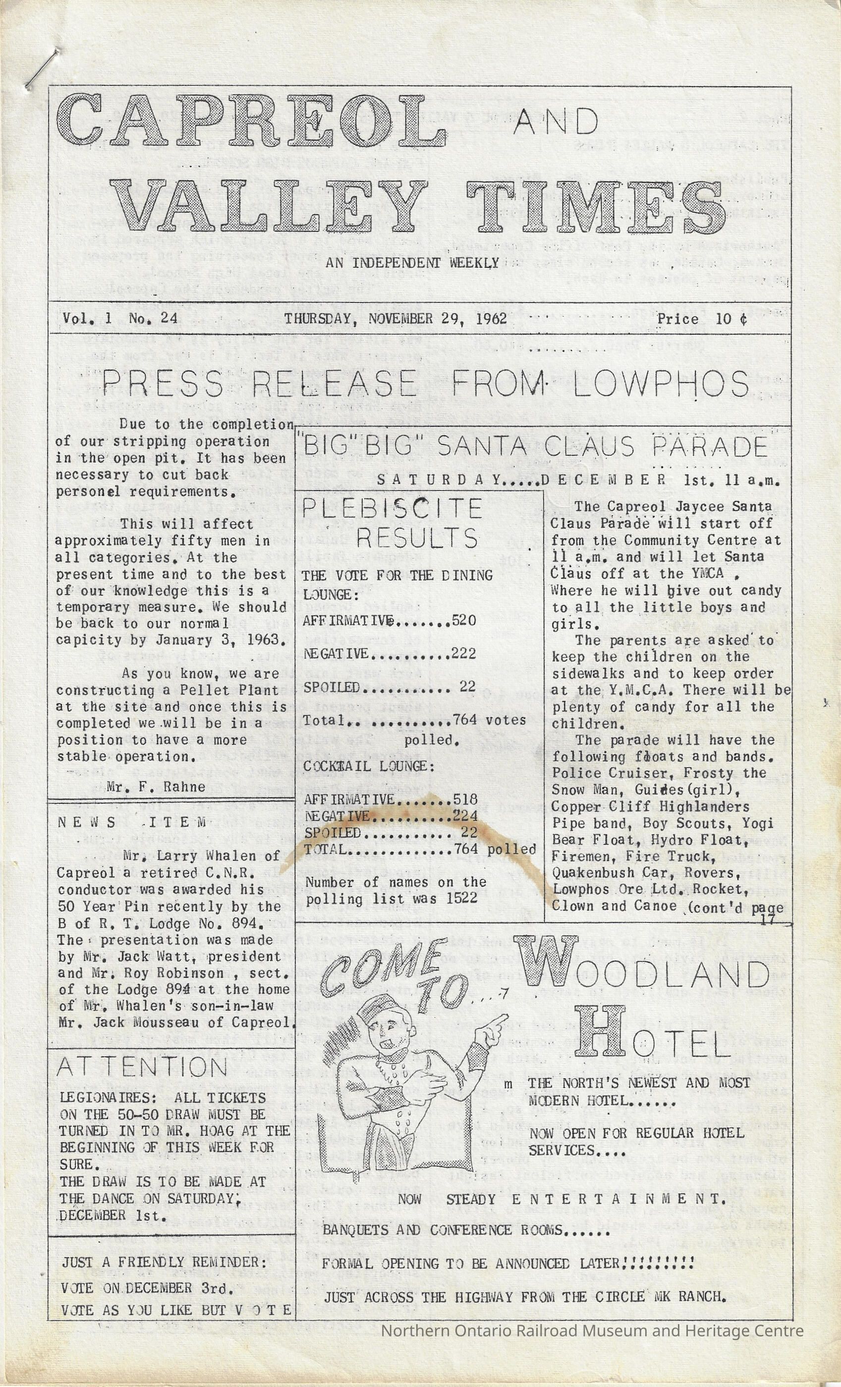 Newsletter, Capreol and Valley Times, volume 1, number 24, November 29th, 1962. The newsletter discusses local news, stories, announcements, events, and concerns. It also includes advertisements for local businesses as well as classified ads in the Capreol and Valley East areas. This newsletter highlights the upcoming Santa Claus parade, the new addition for the Capreol High School, as well as an election campaign for Harold Prescott, as the election would be happening 4 days after the publication of the newsletter.