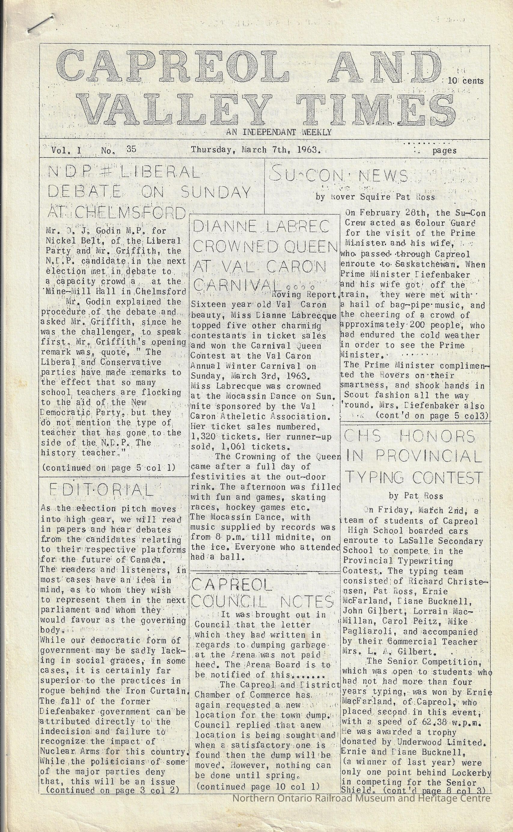 The Capreol and Valley Times: Vol 1 (35) March 7th, 1963Entry/Object ID