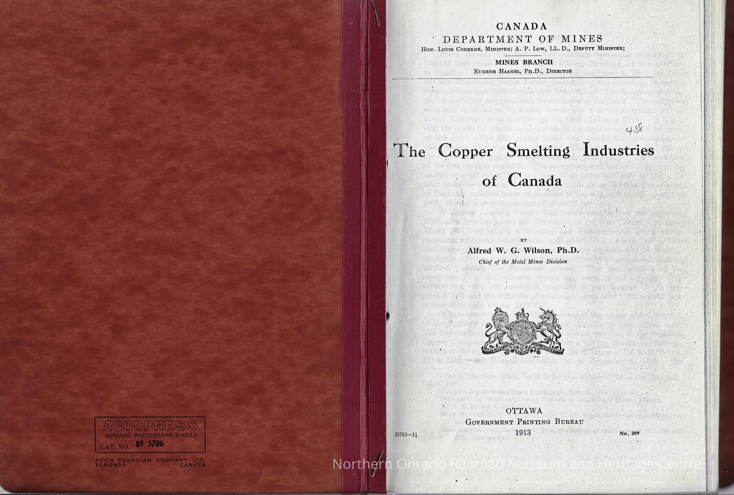 Book, report discussing the state of the Copper Smelting Industries of Canada as of 1913.Context