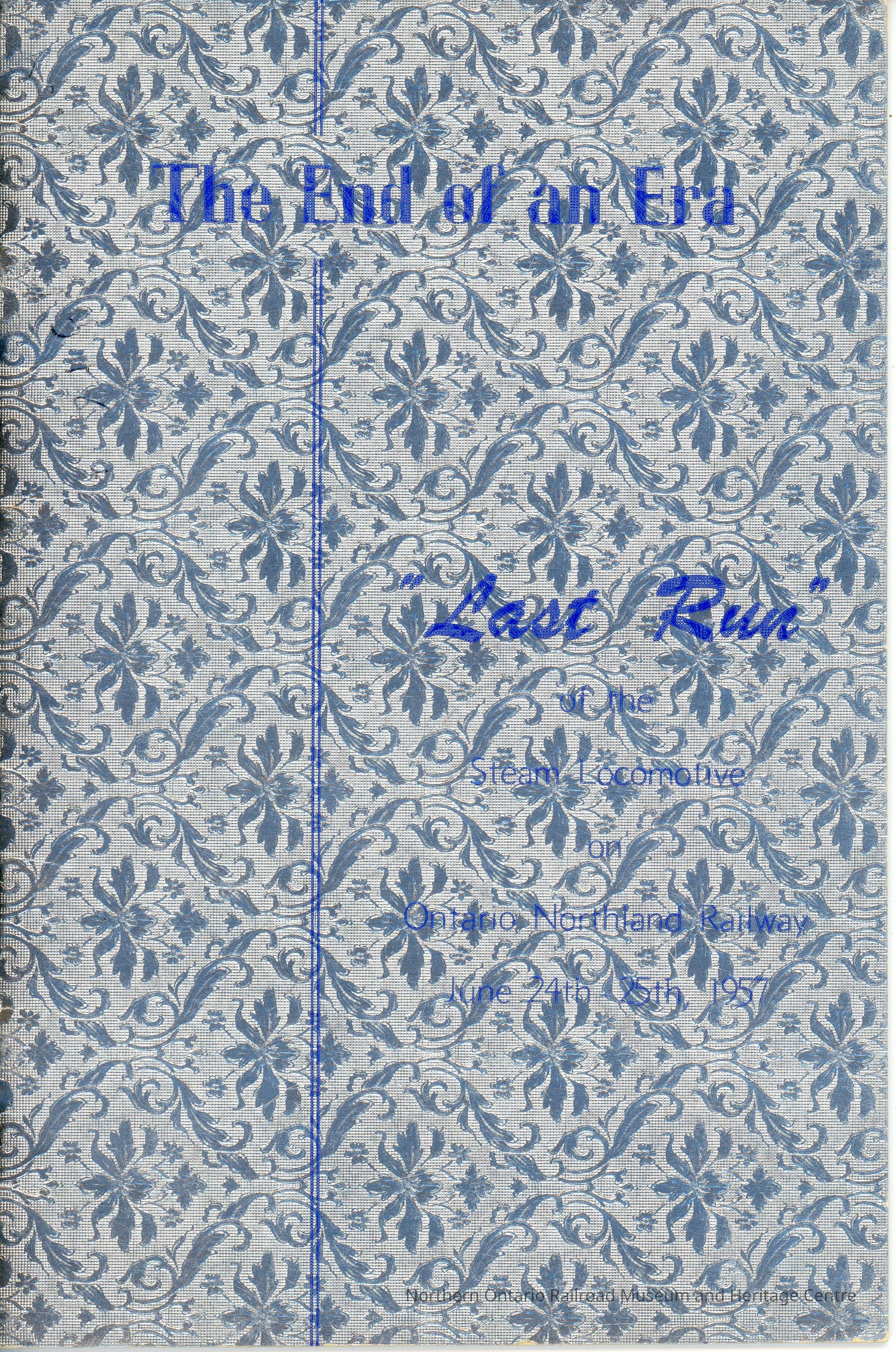 Two copies of "The End of an Era: "Last: Run of the Steam Locomotive on the ONR, June 24-25th, 1957" (Booklet). Silver cover with text in blue ink.Context