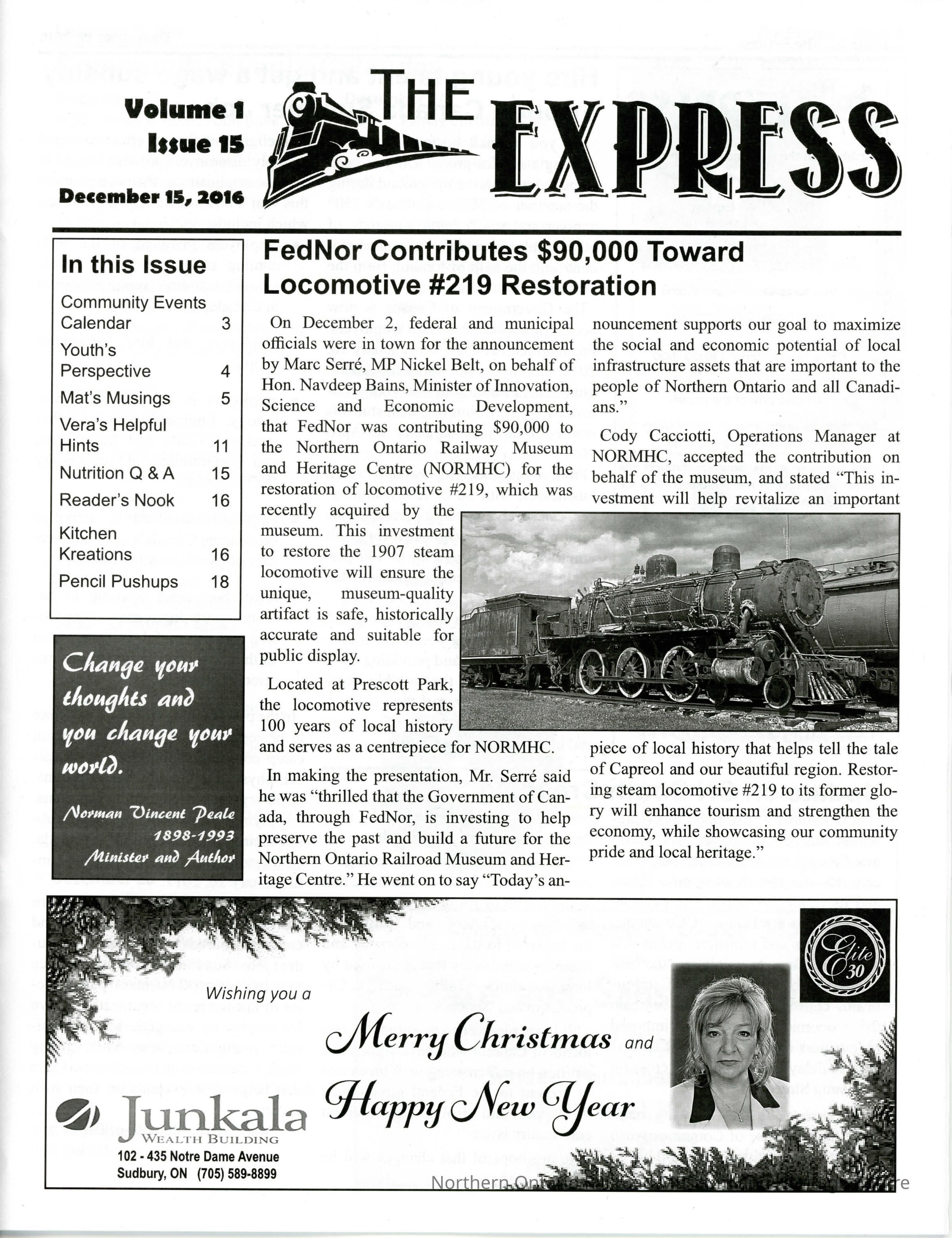 The Express (Vol. 1, Iss. 15) Cover Page, Cover story of $90,000 funding announcement for Locomotive #219 at NORMHCCollection