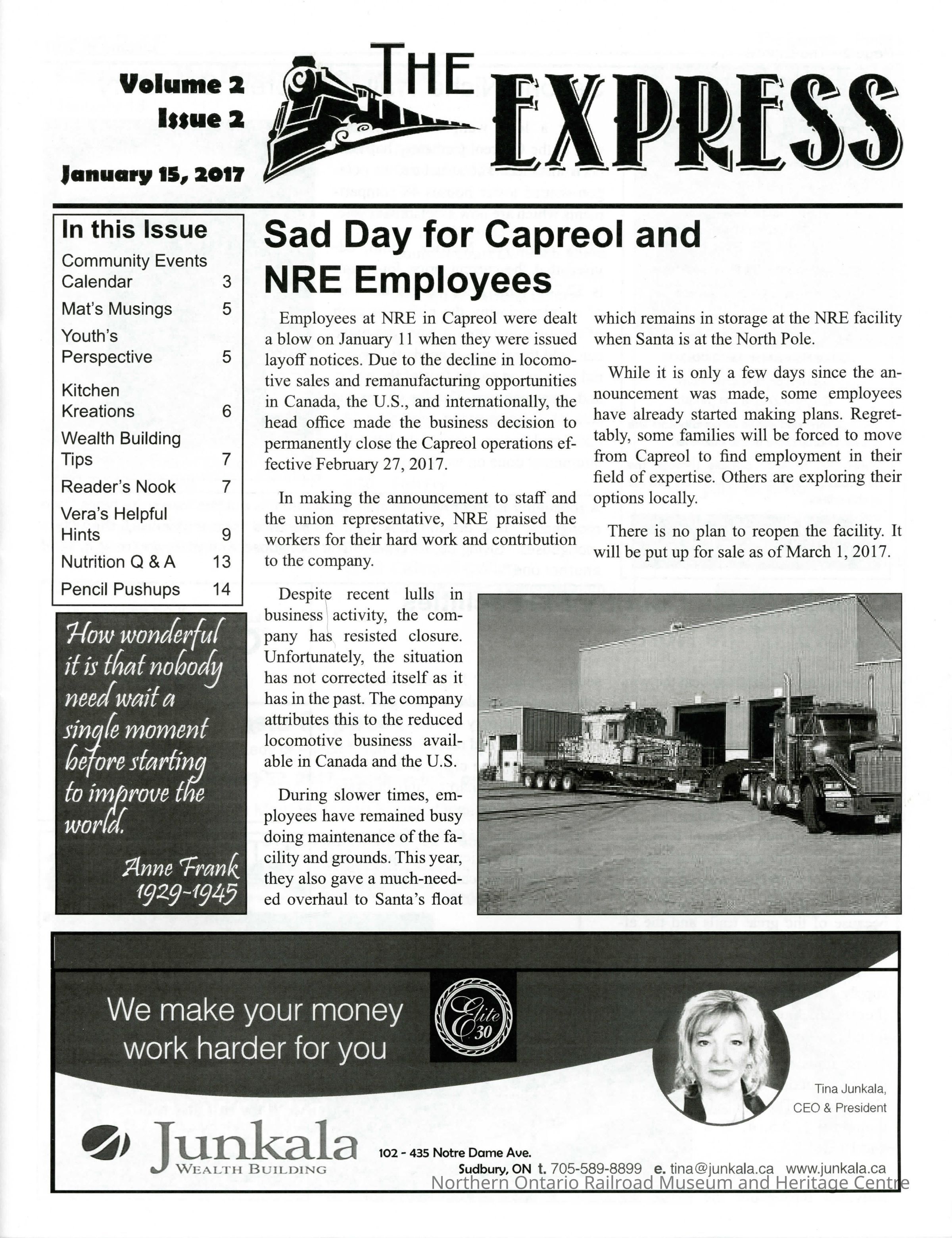 The Express (Vol. 2, Iss. 2) Cover Page, Cover Story of the NRE shutting down in Capreol, Ontario.Collection