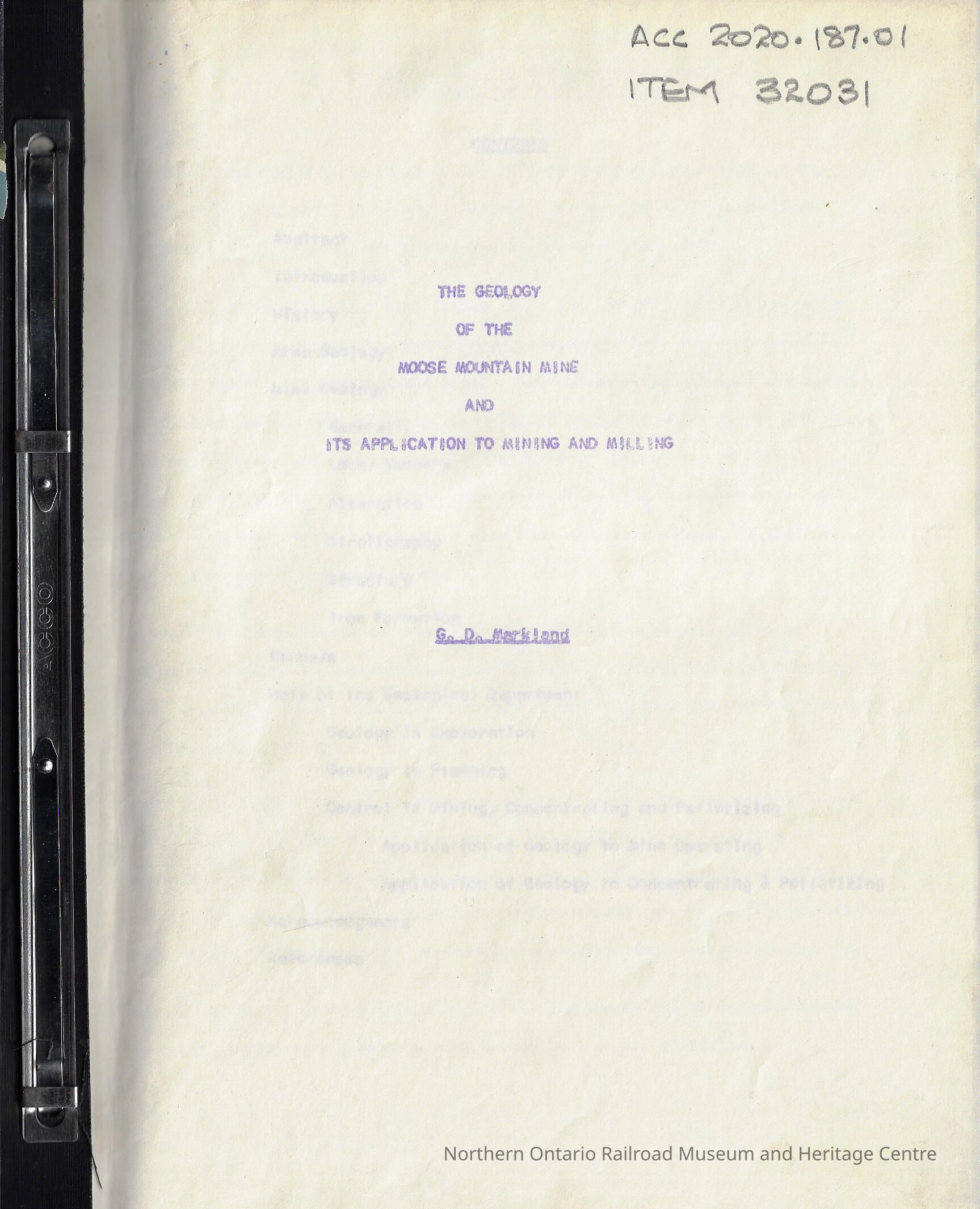 Book, report on the geology of the Moose Mountain Mine and the application to mining and milling. It is bound in a black binder.Creator