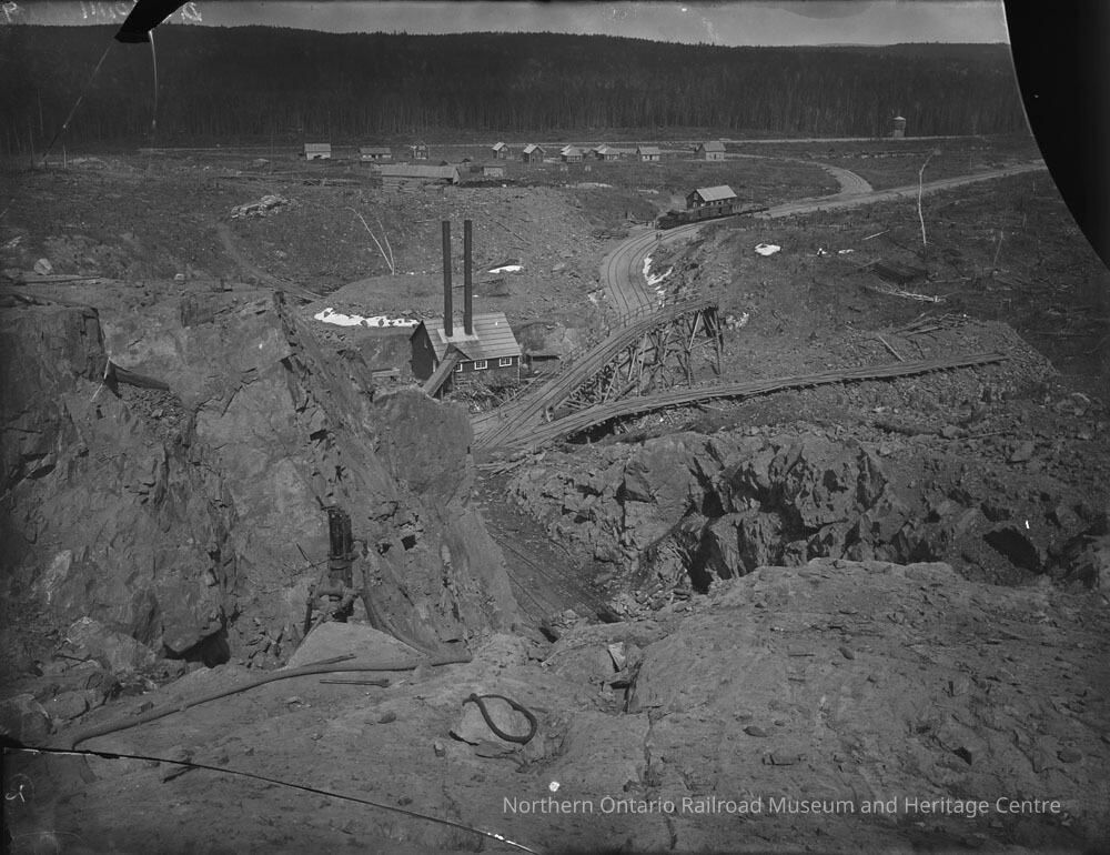 Black and white photograph showing an aerial view of the Moose Mountain Mine in Sellwood, Ontario. The photograph was likely taken in the 1910s, exact date is unknown. The head frame is visible.Photograph Details