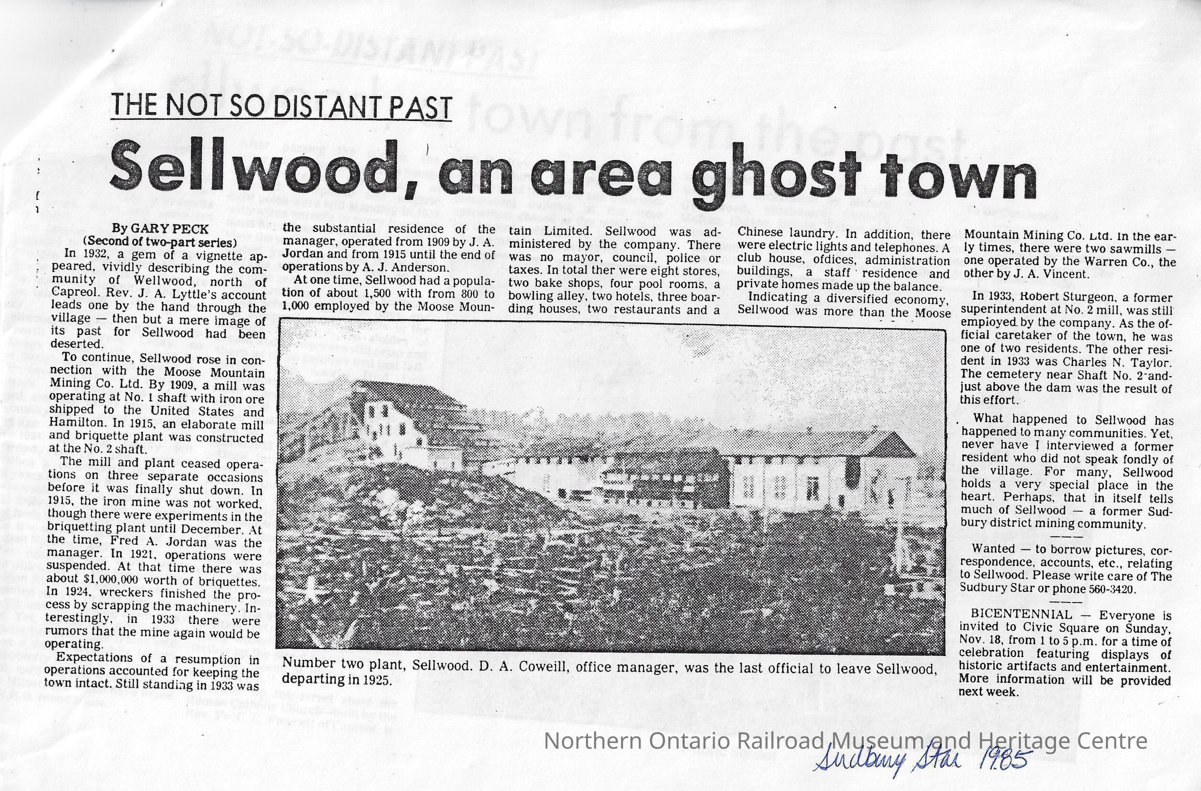 Newspaper clipping discussing the history of the town of Sellwood, Ontario and the Moose Mountain Mine.Context