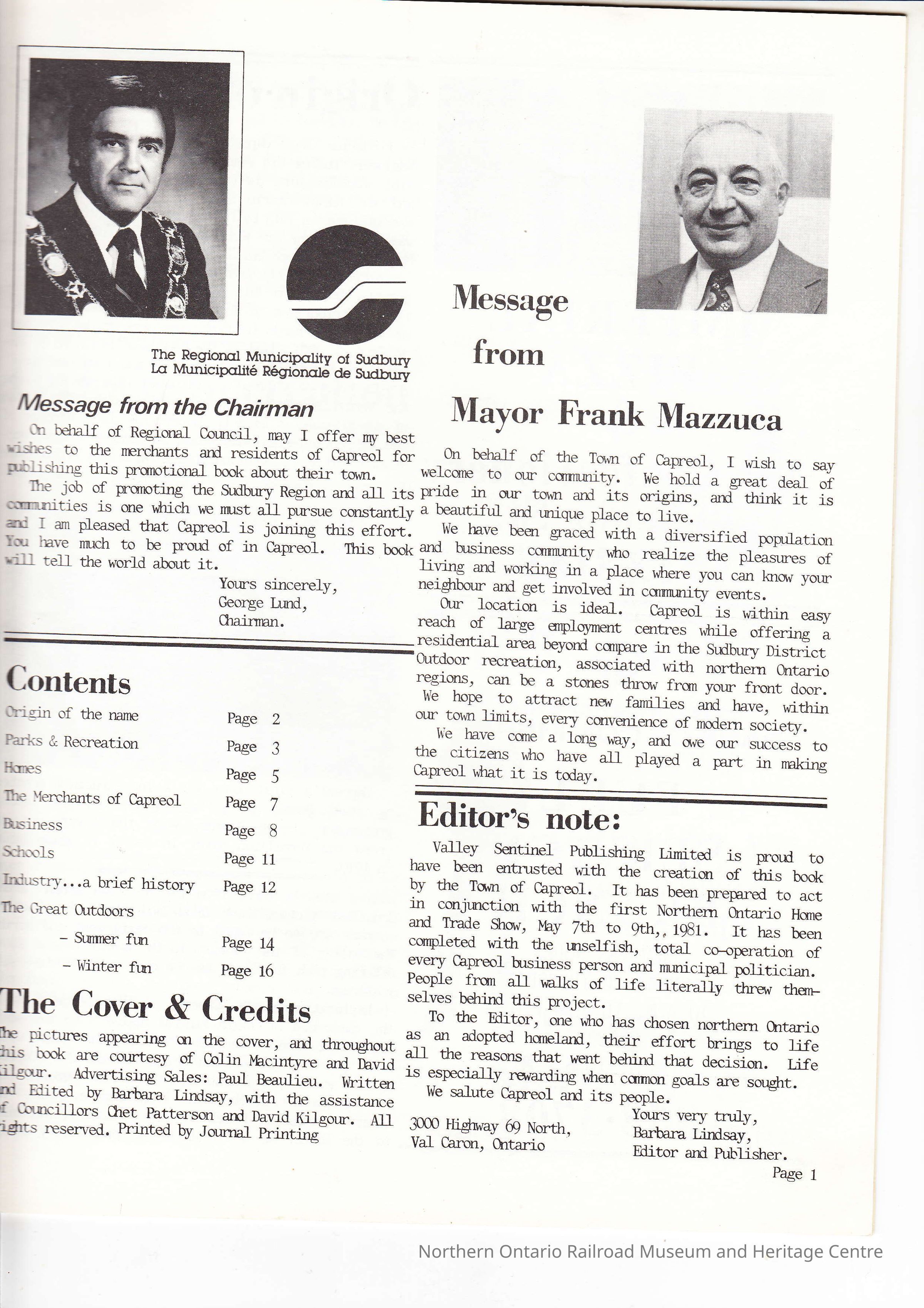 "This Is Capreol" By Barbara Lindsay (Editor), created for the first Northern Ontario Home and Trade show on May 7-9, 1981. Features businesses and places in Capreol.Collection