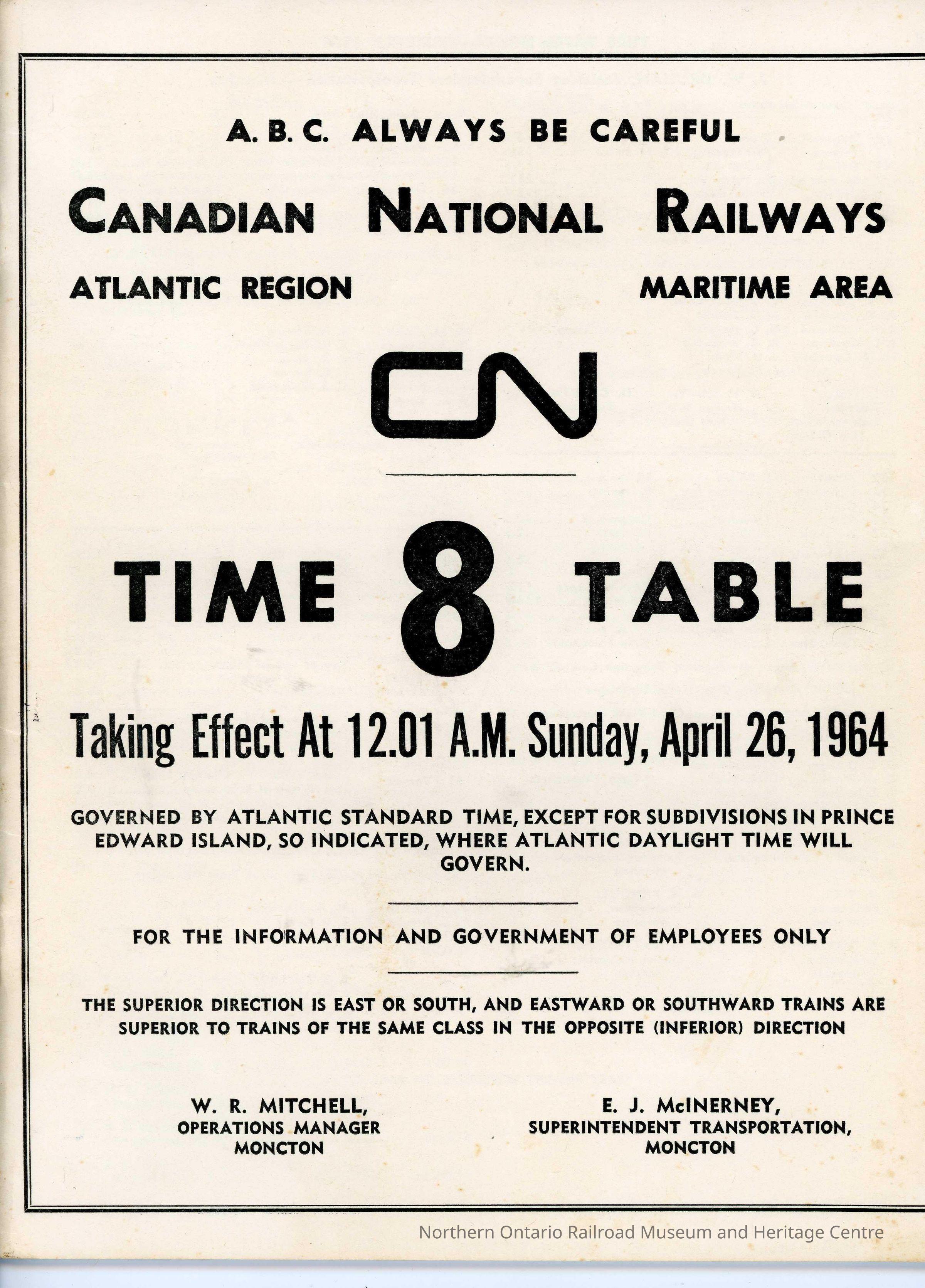 Timetable, CN Atlantic Region Maritime Area 8, April 26, 1964Collection