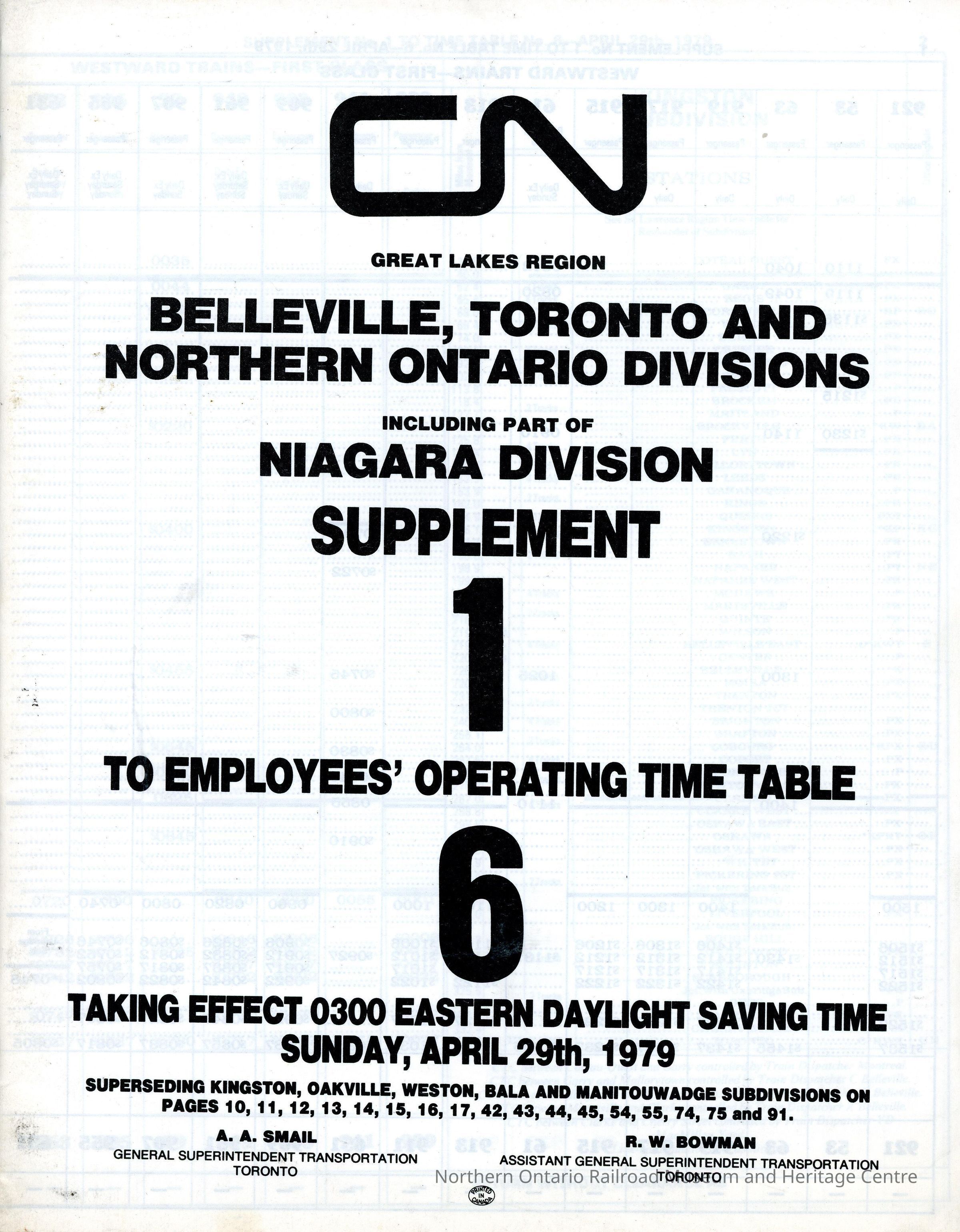 Timetable, CN Belleville, Toronto and Northern Ontario Supplement 1 to Timetable 6. April 29th 1979.Collection