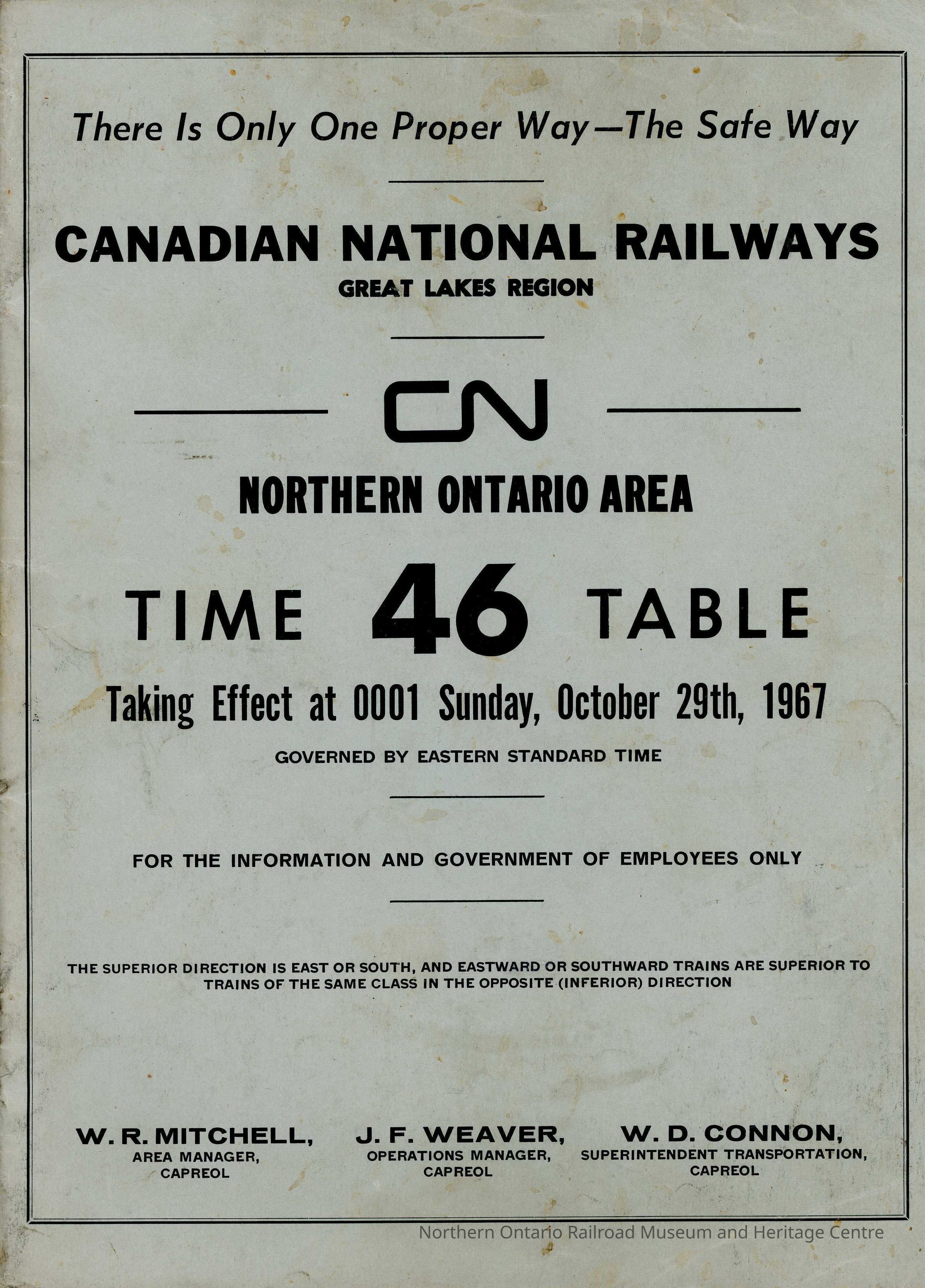 Timetable, CN Great Lakes Region Northern Ontario Area 46, October 29th 1967.Collection