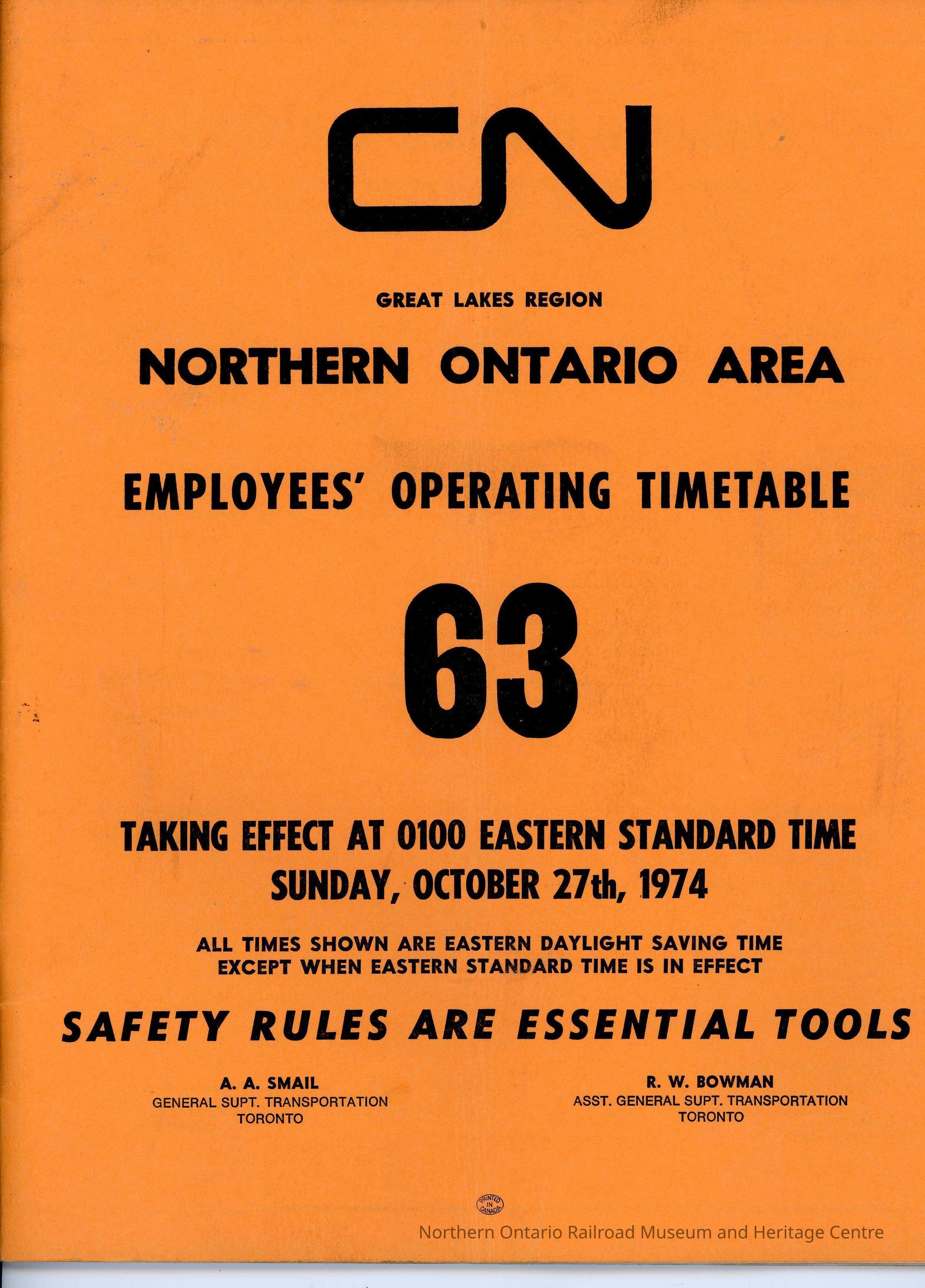 Timetable, CN Northern Ontario 63, October 27th, 1974.Collection