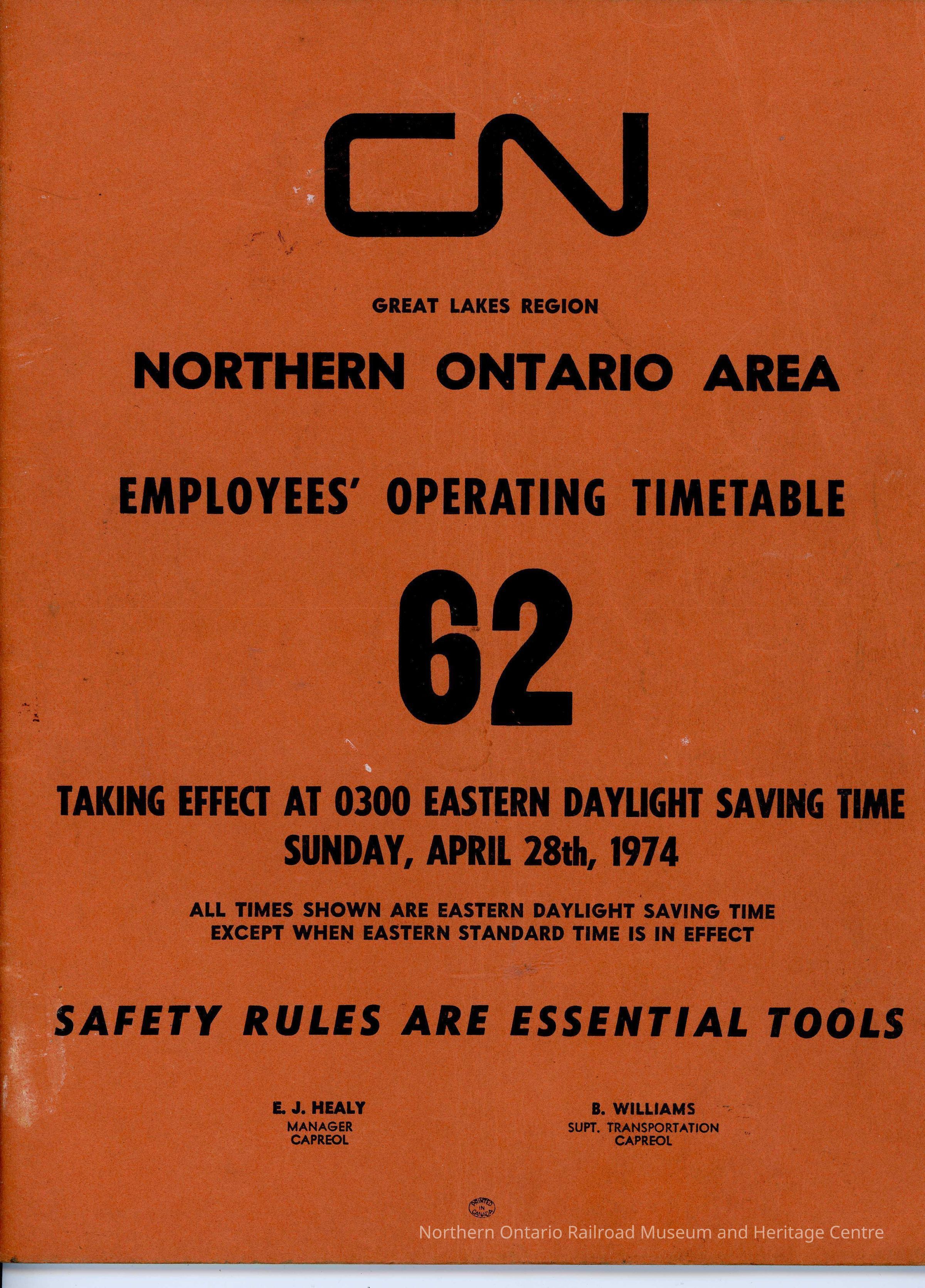 Timetable, CN Northern Ontario Area 62, April 28th 1974.Collection