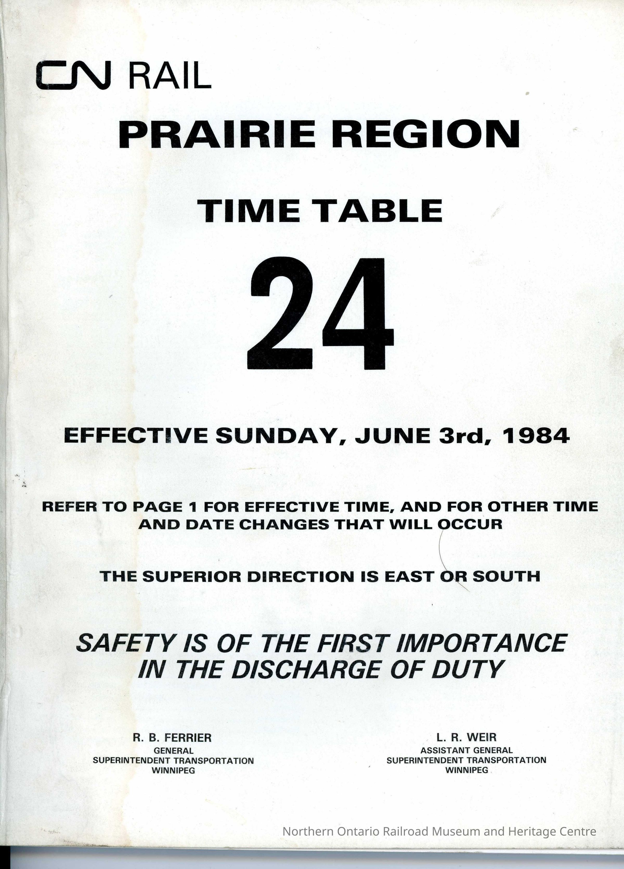 Timetable, CN Prairie Region 24, June 3rd 1984.Collection