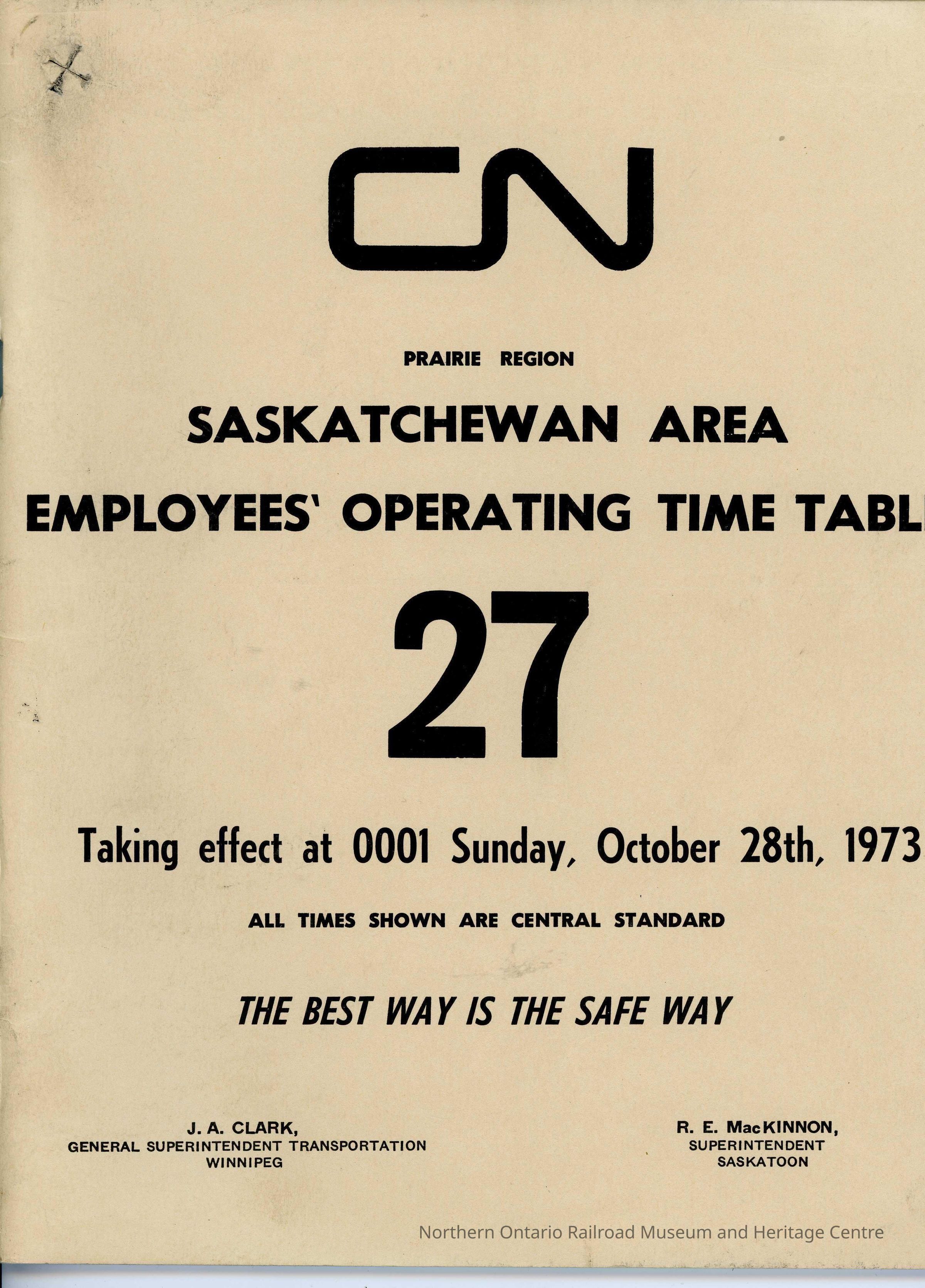 Timetable, CN Saskatchewan Area 27, October 28th 1973.Collection