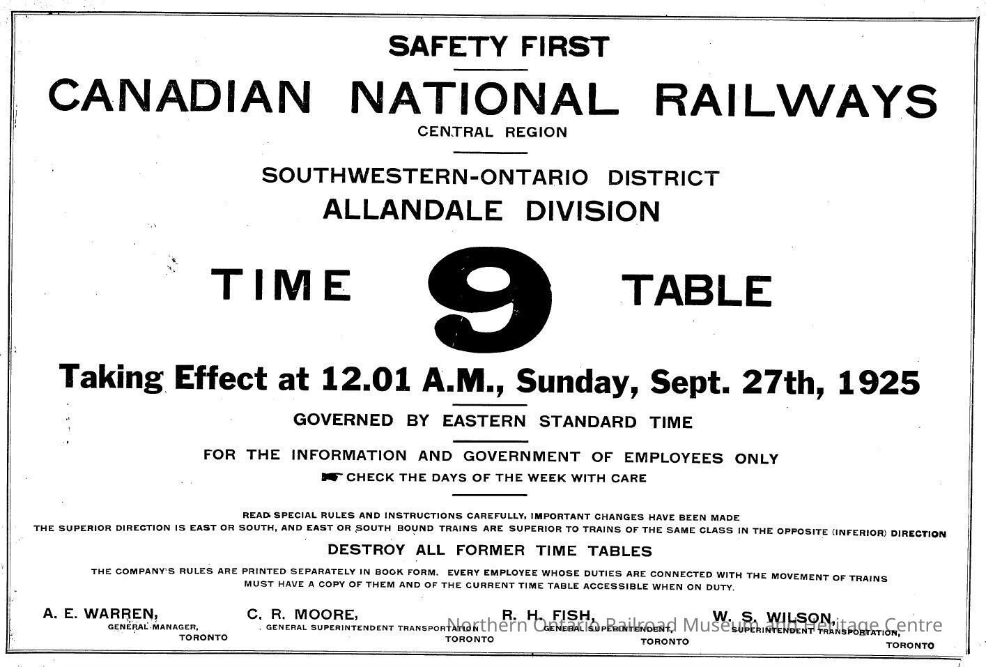 Timetable, CNR 9, September 27th 1925, Allandale Division.Collection