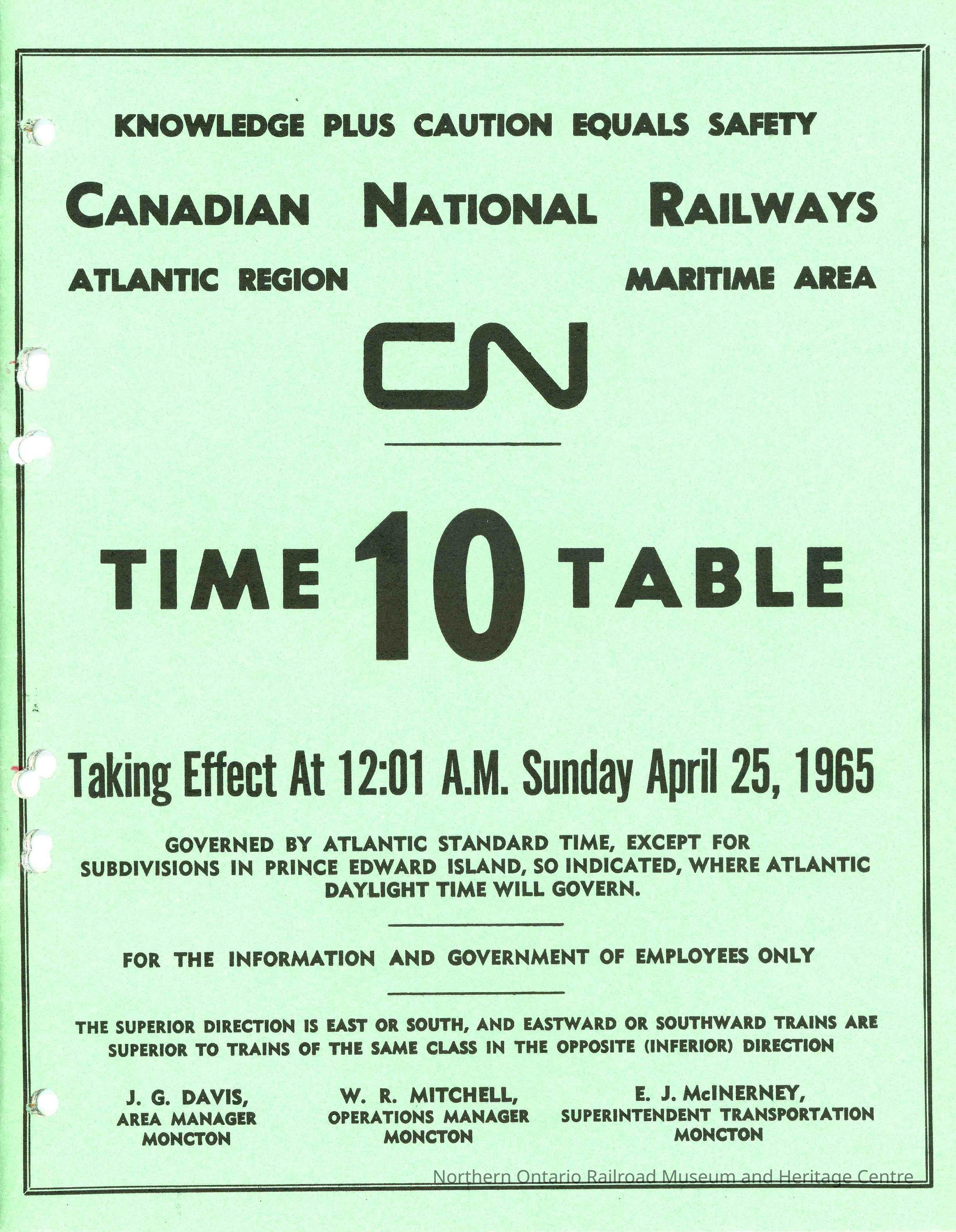 Timetable, CNR Altantic Region - Maritime Area 10, April 25, 1965Collection