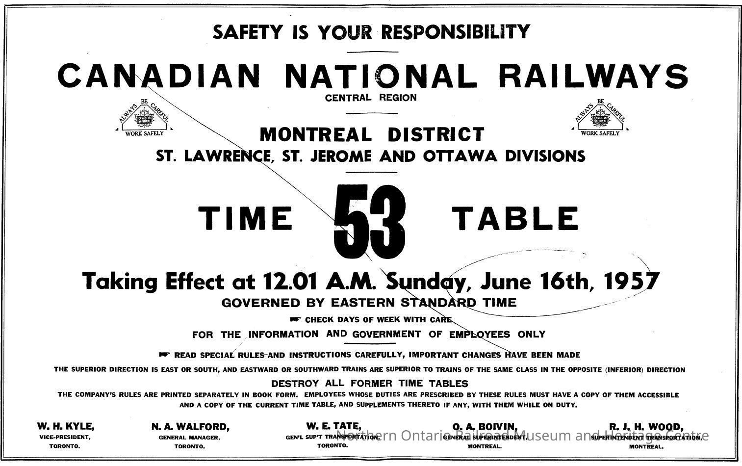 Timetable, CNR Montreal District 53, June 16th 1957.Collection