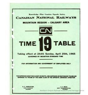 Timetable, CNR Mountain Region - Calgary Area 19, April 25th 1965.Collection