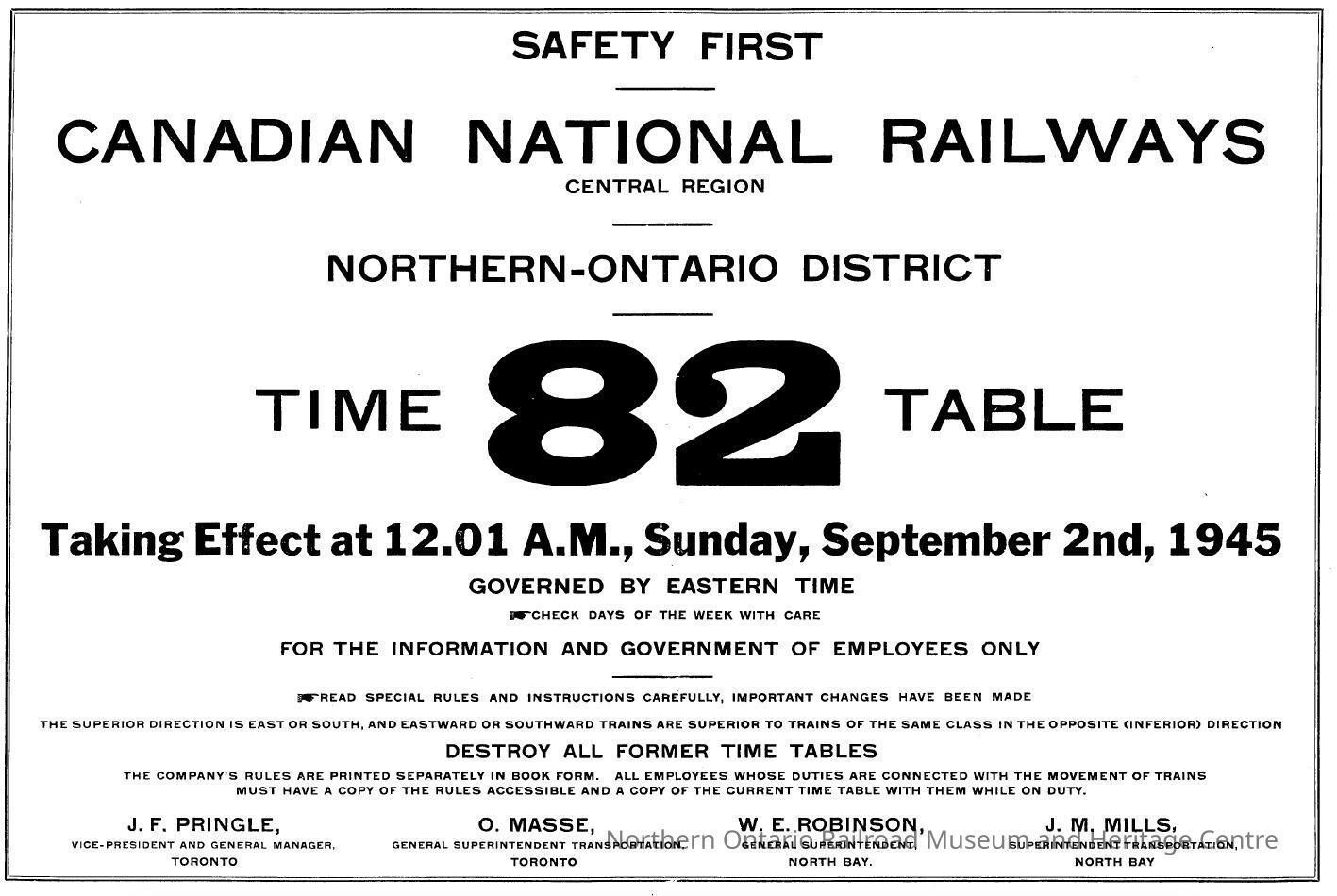 Timetable, CNR Northern Ontario 82, September 2nd 1945.Collection