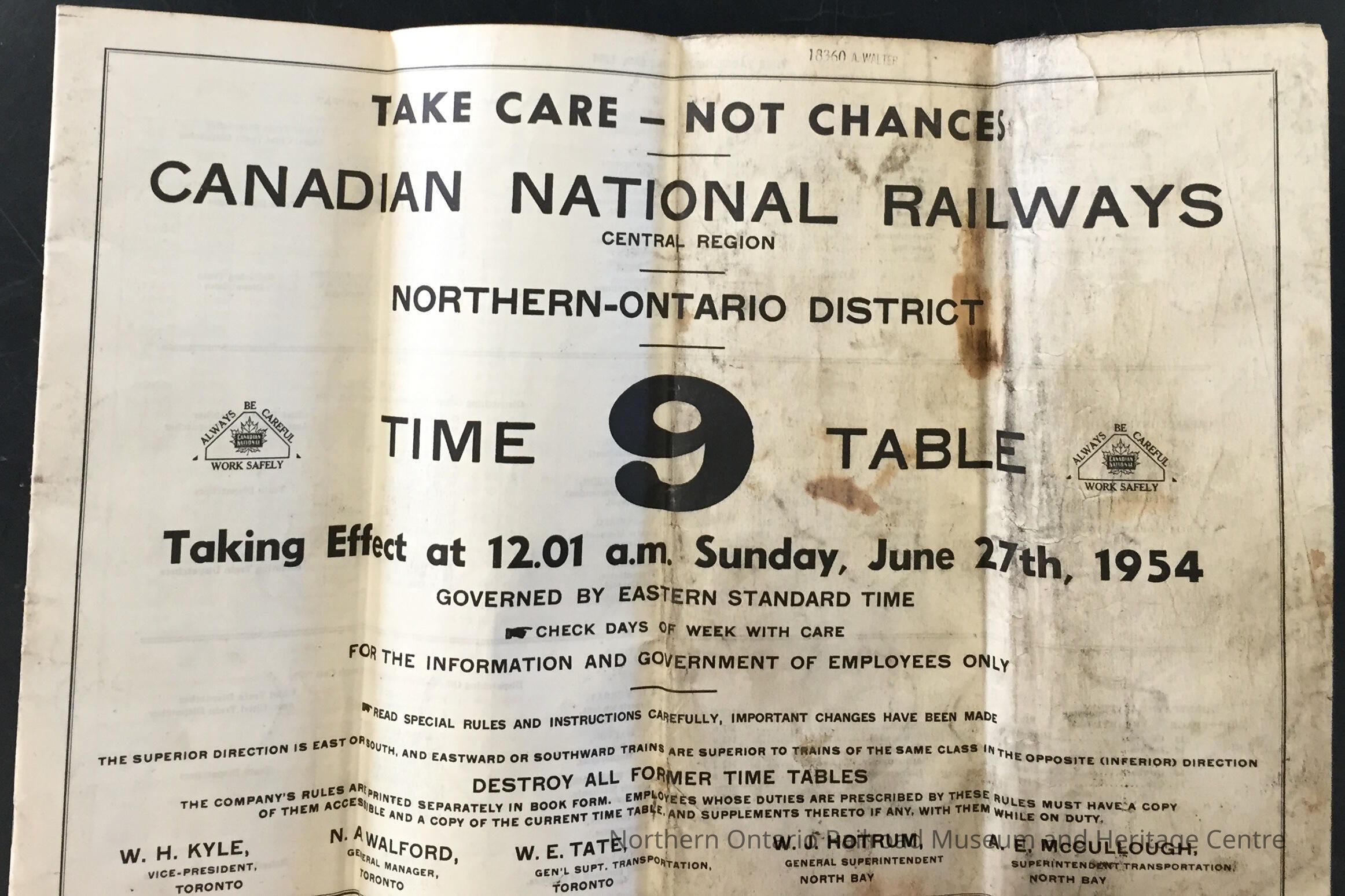 Timetable, CNR Northern Ontario District 9, June 27th 1954Collection