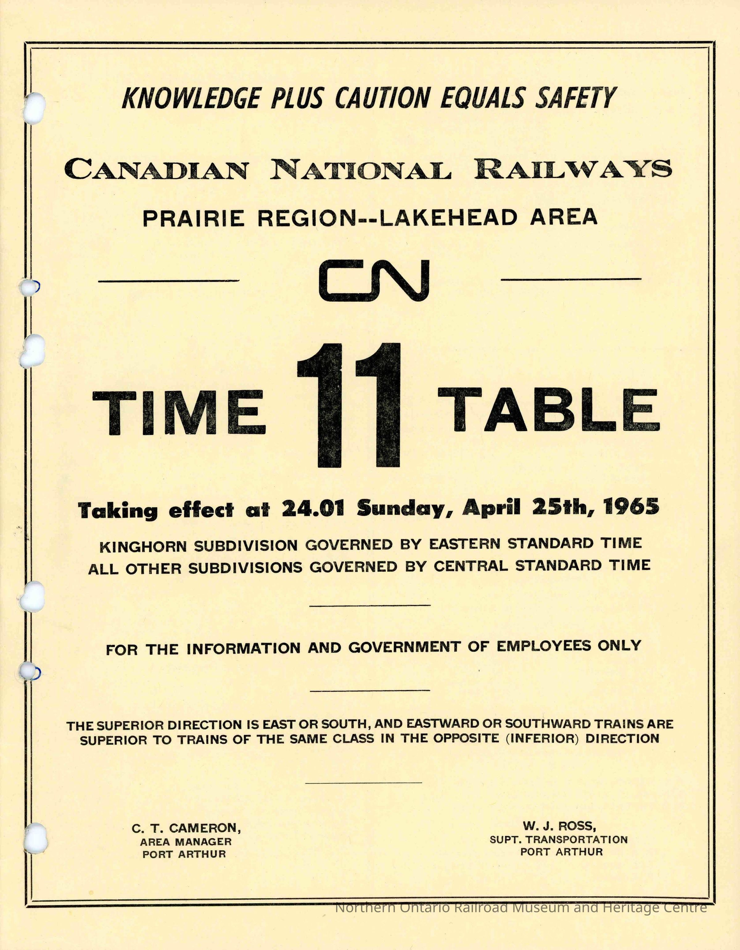 Timetable, CNR Prairie Region - Lakehead Area 11 April 25th 1965Collection