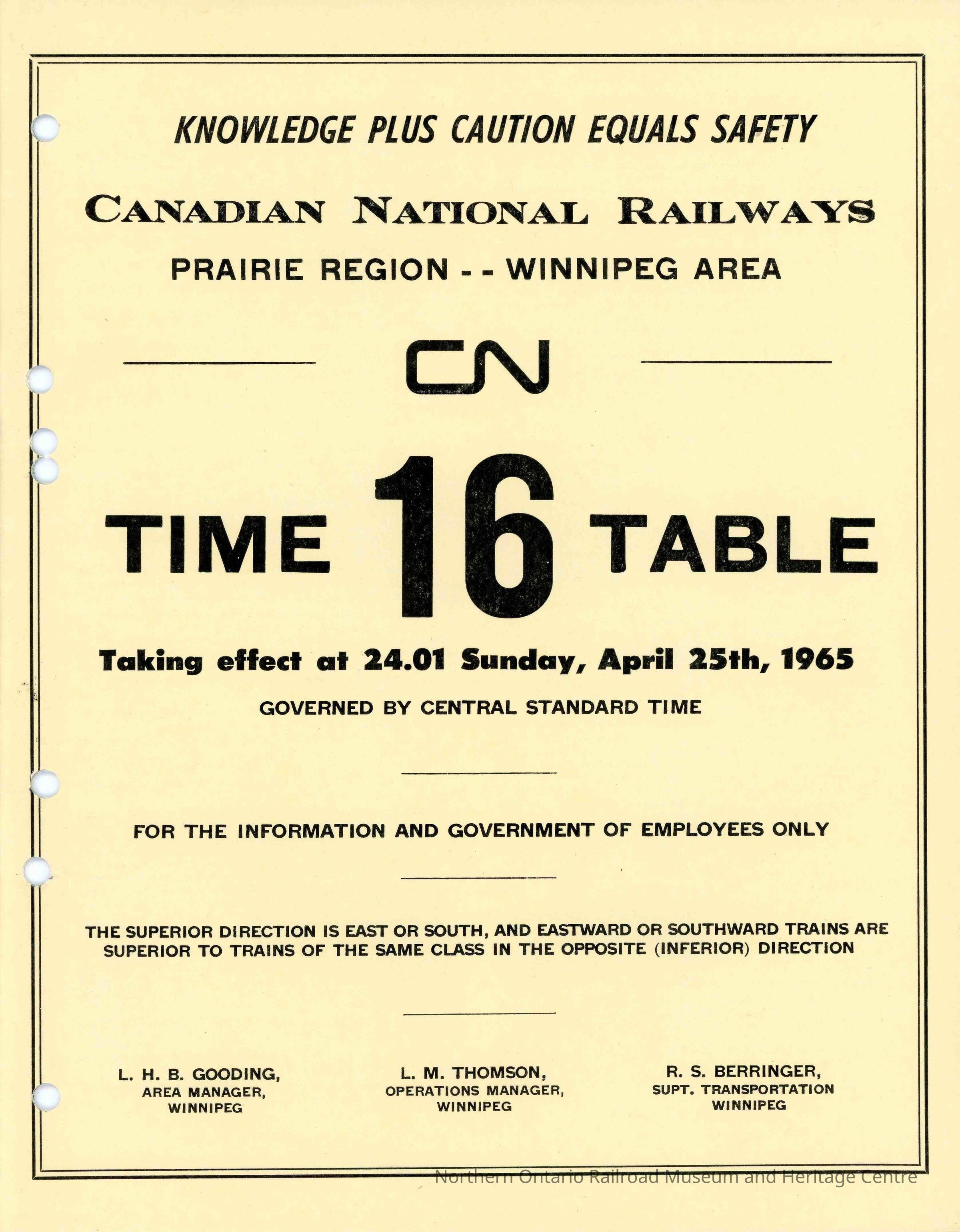 Timetable, CNR Prairie Regon - Winnipeg Area 16, April 25th 1965Collection