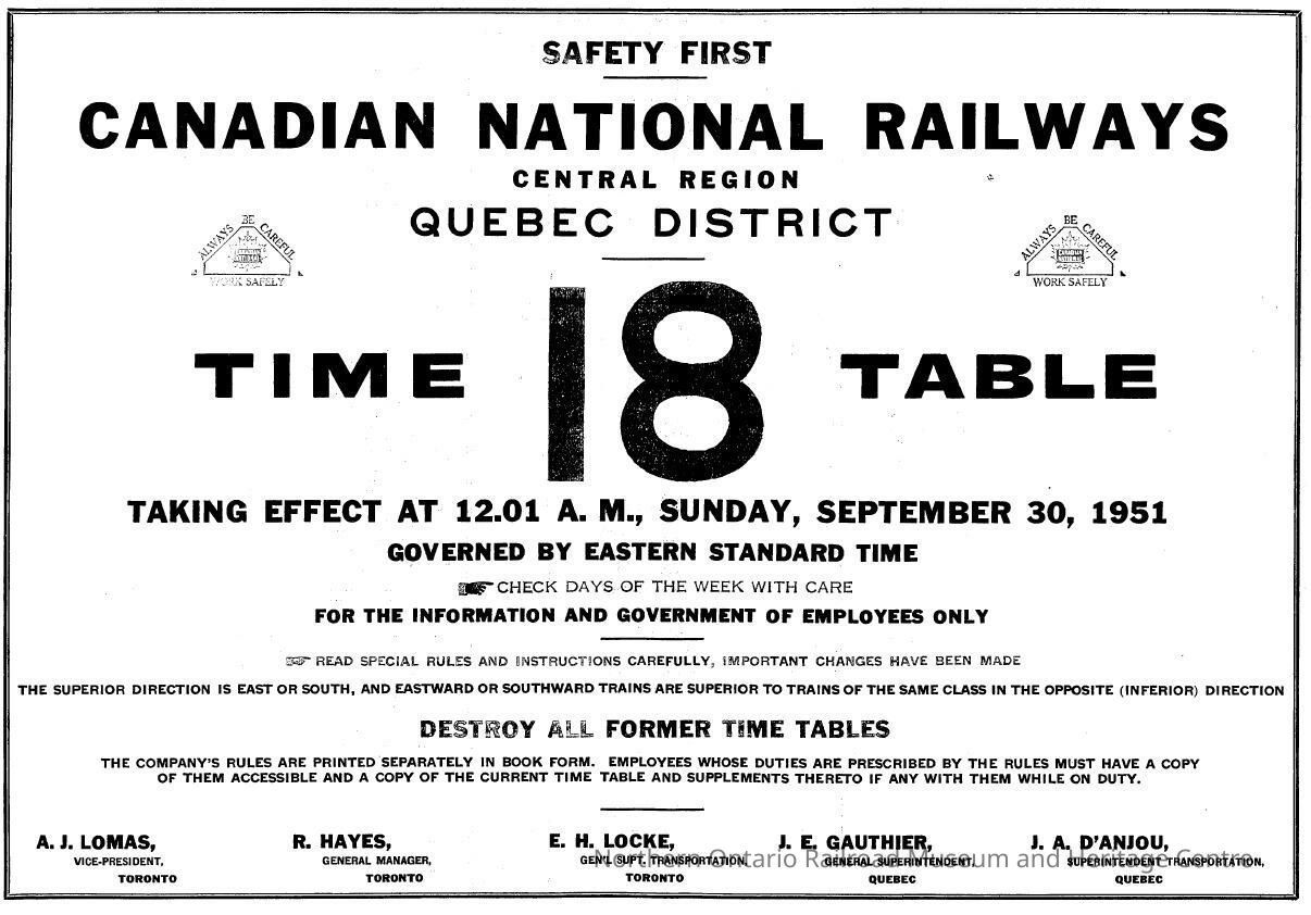 Timetable, CNR Quebec District 18, September 30th 1951.Collection