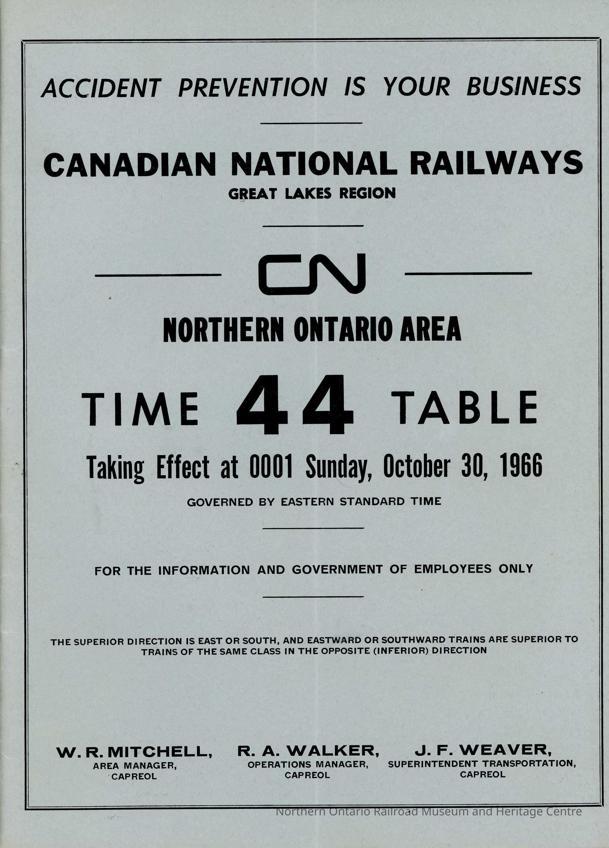 Timetable, Northern Ontario 44, October 30, 1966.Collection