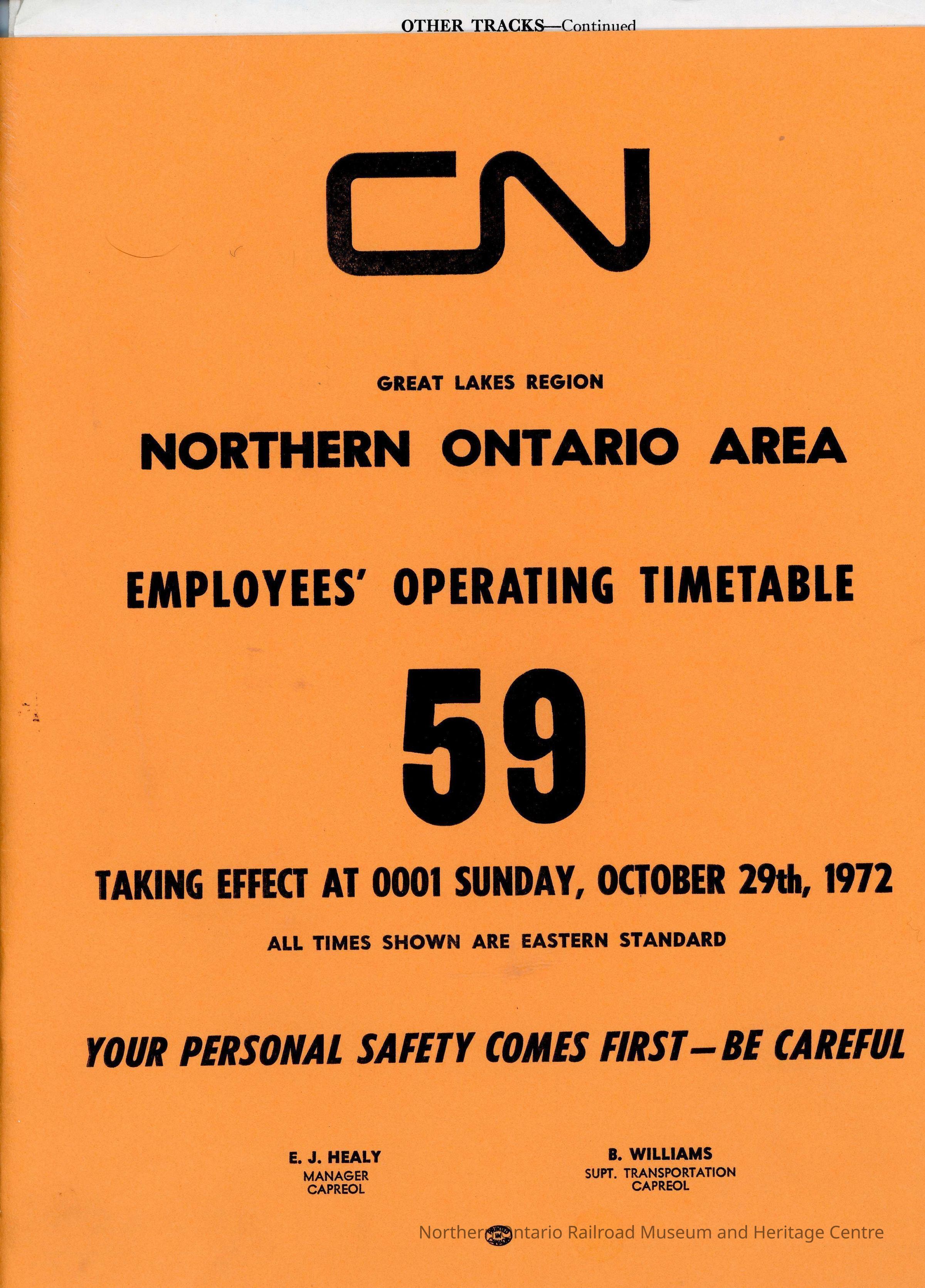 Timetable, Northern Ontario 59, October 29th 1972.Collection