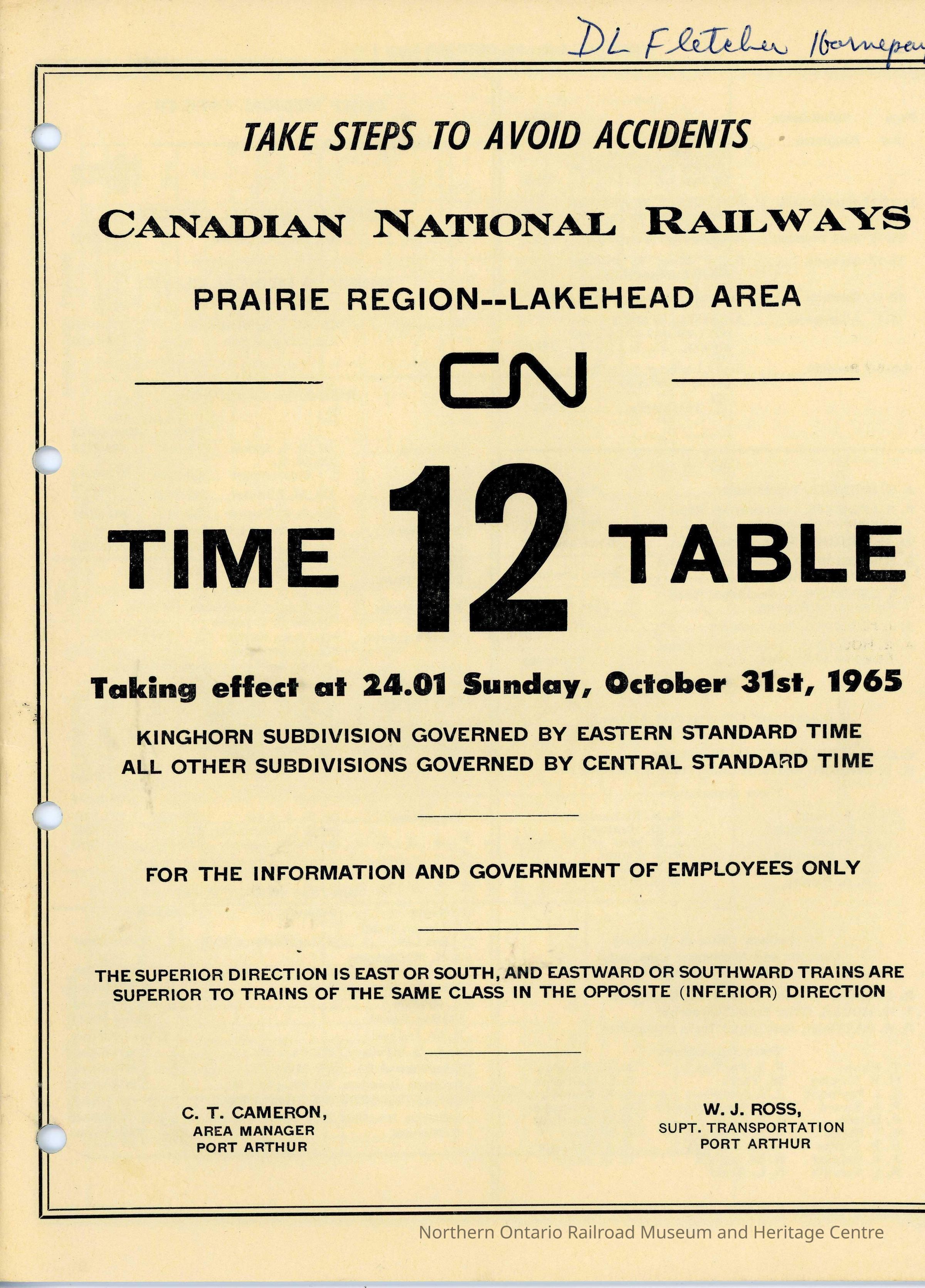 Timetable, Prairie Region - Lakehead Area 12, October 31st 1965Collection