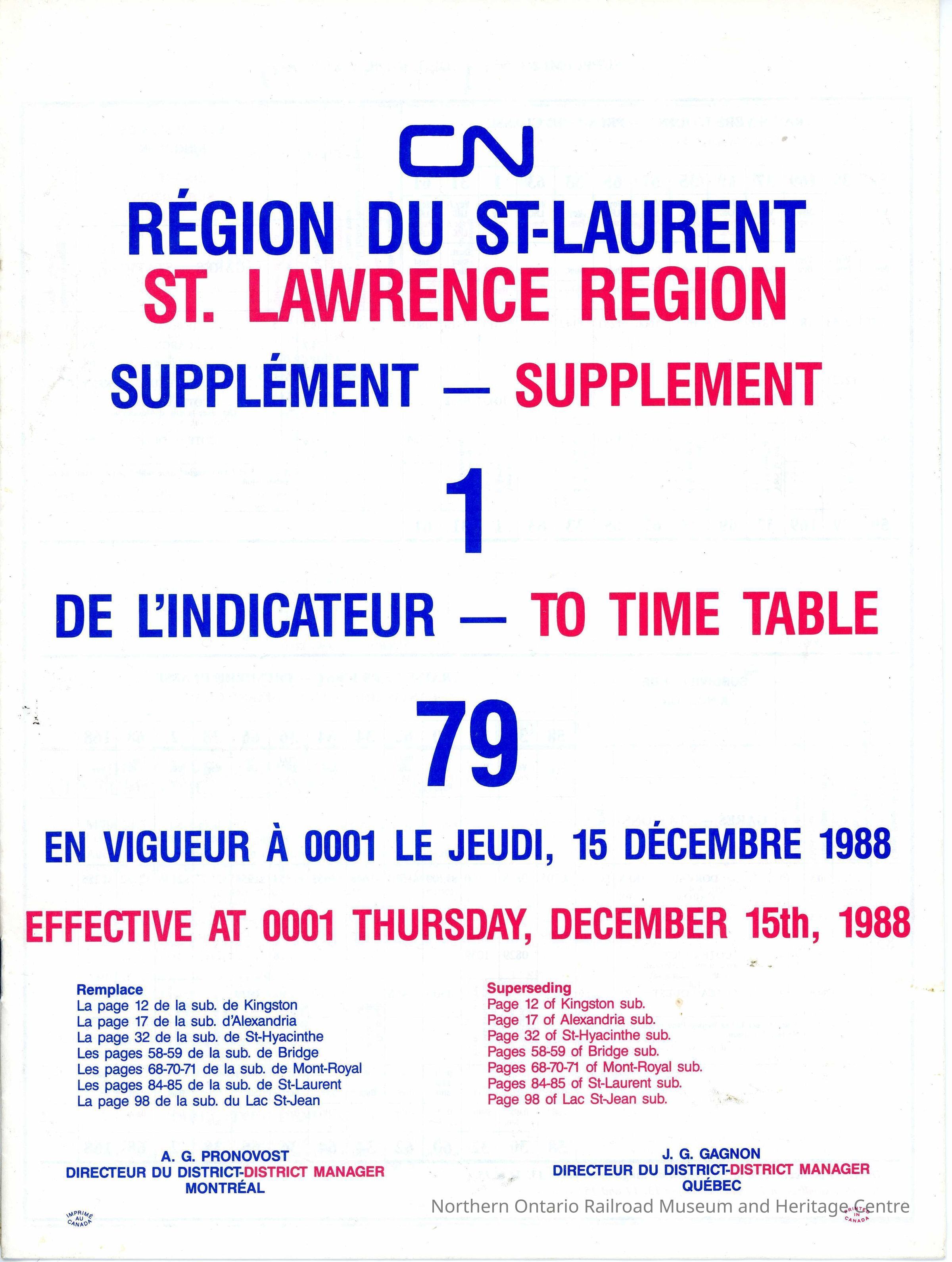 Timetable Supplement 1 to St. Lawrence Region 79, December 15th 1988.Collection