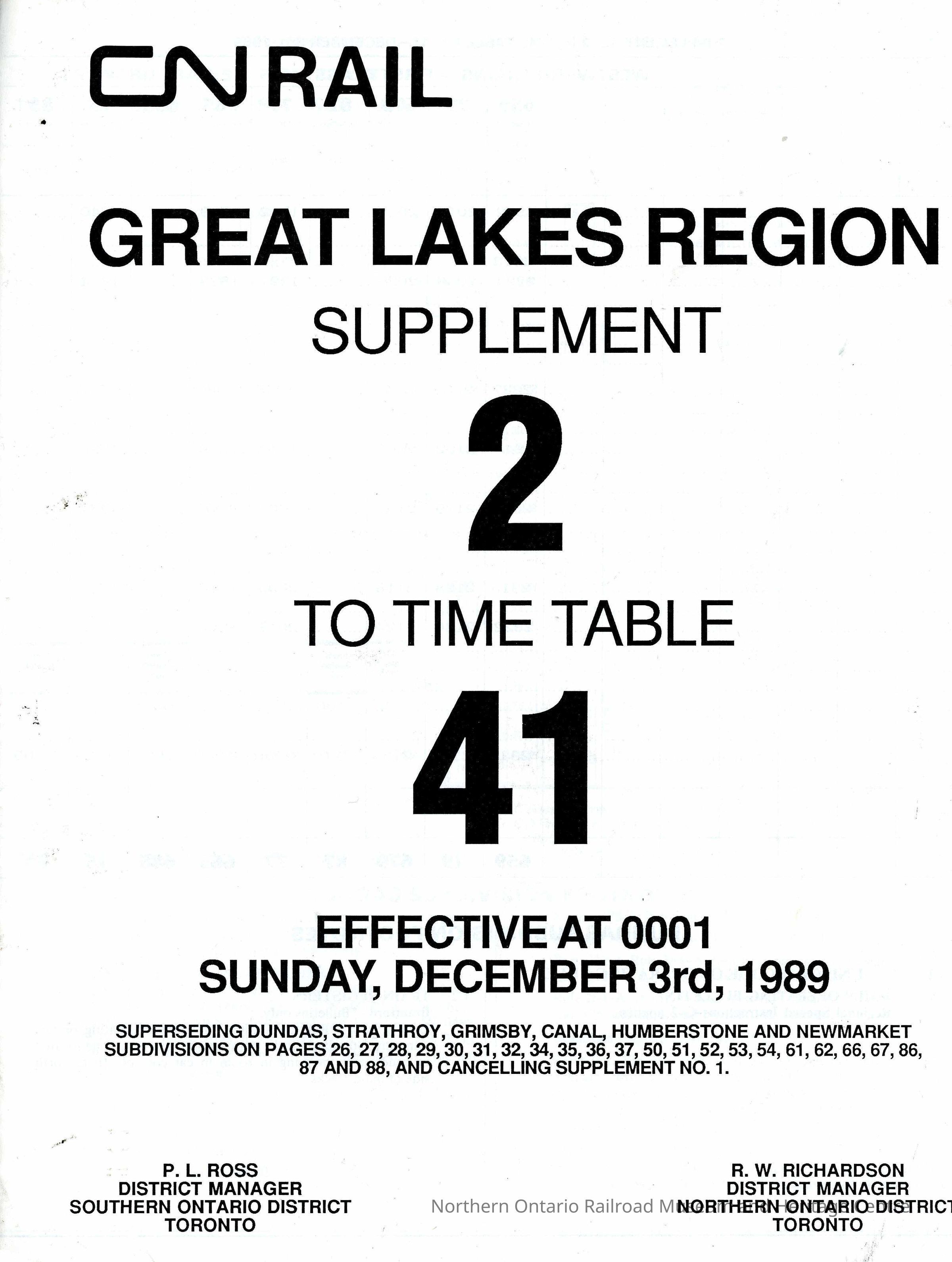 Timetable, Supplement 2 Great Lakes Region 41, December 3rd, 1989.Collection